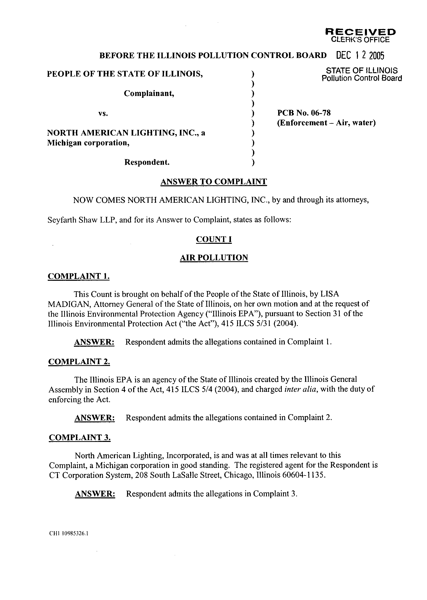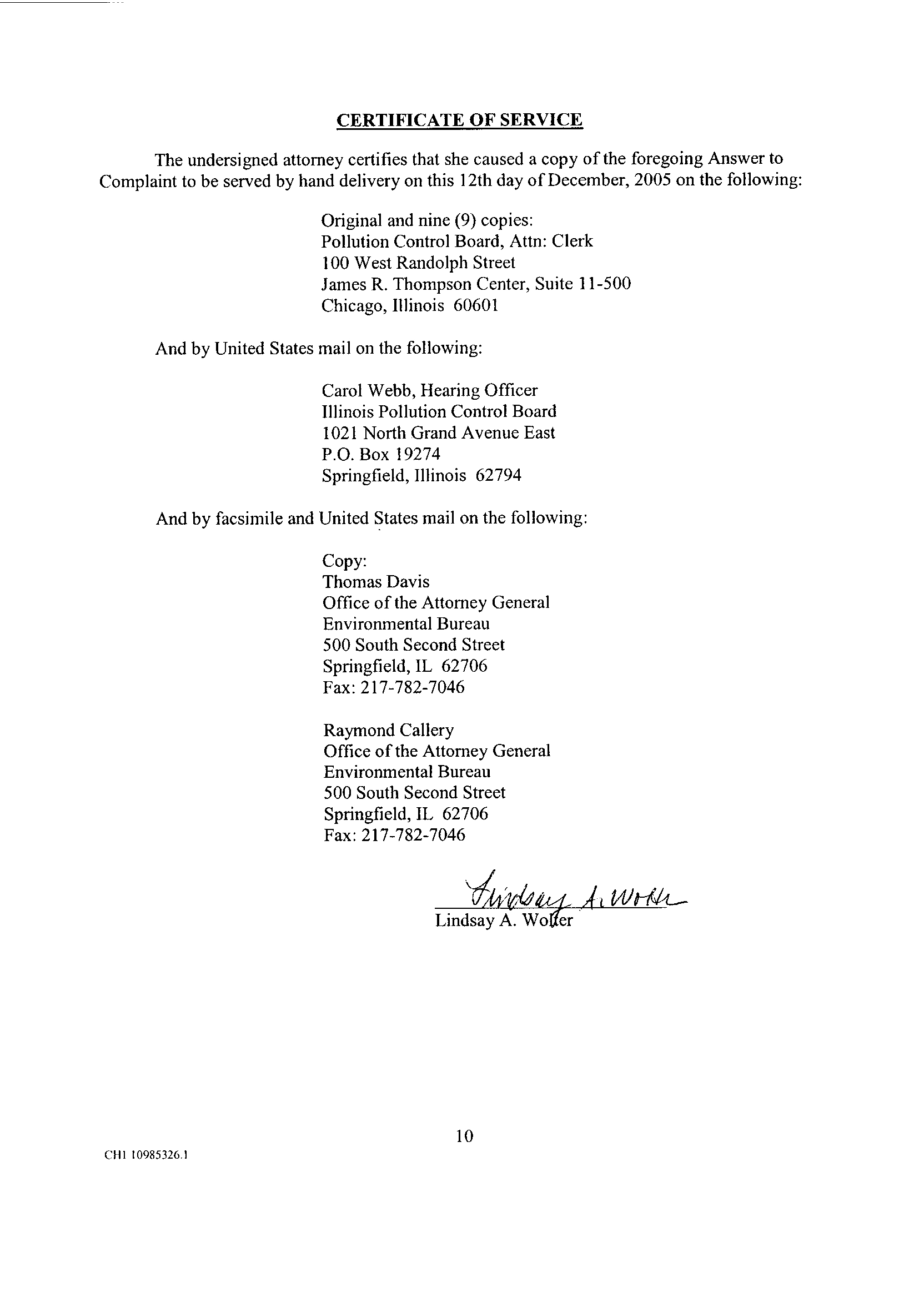 Pollution Control Board, Attn: Clerk
