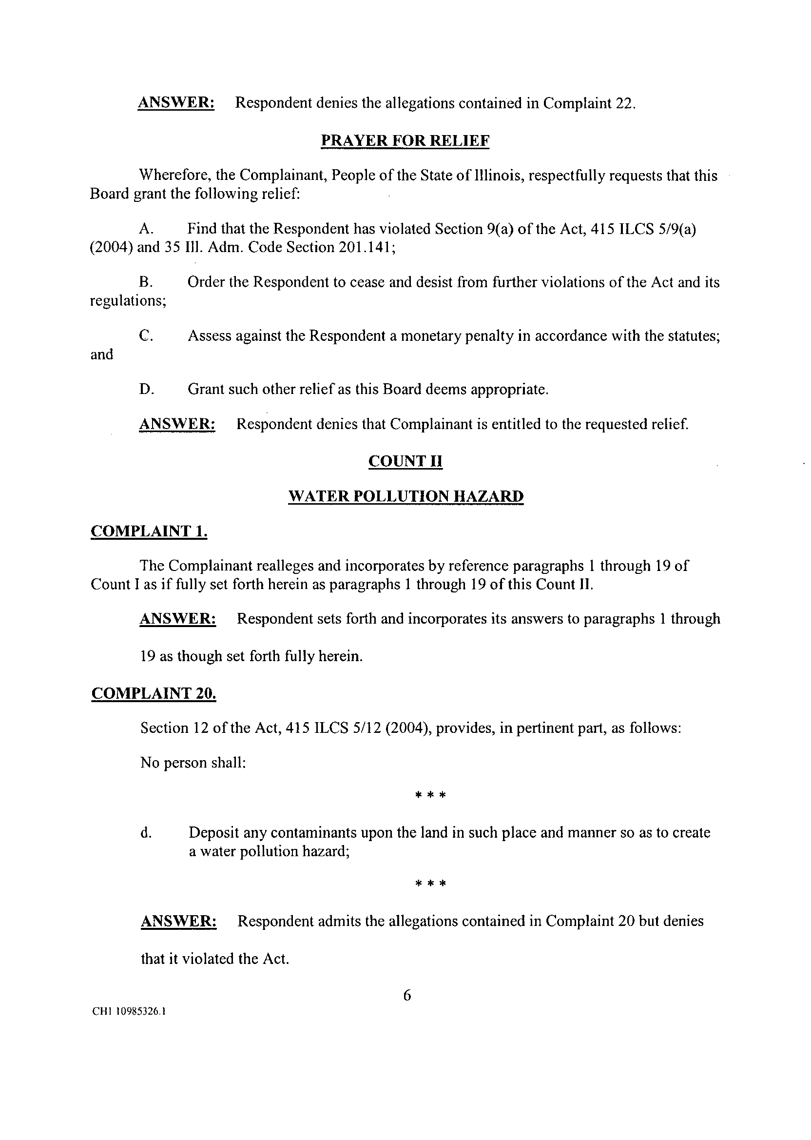 Respondent admits the allegations contained in Complaint 6 but denies