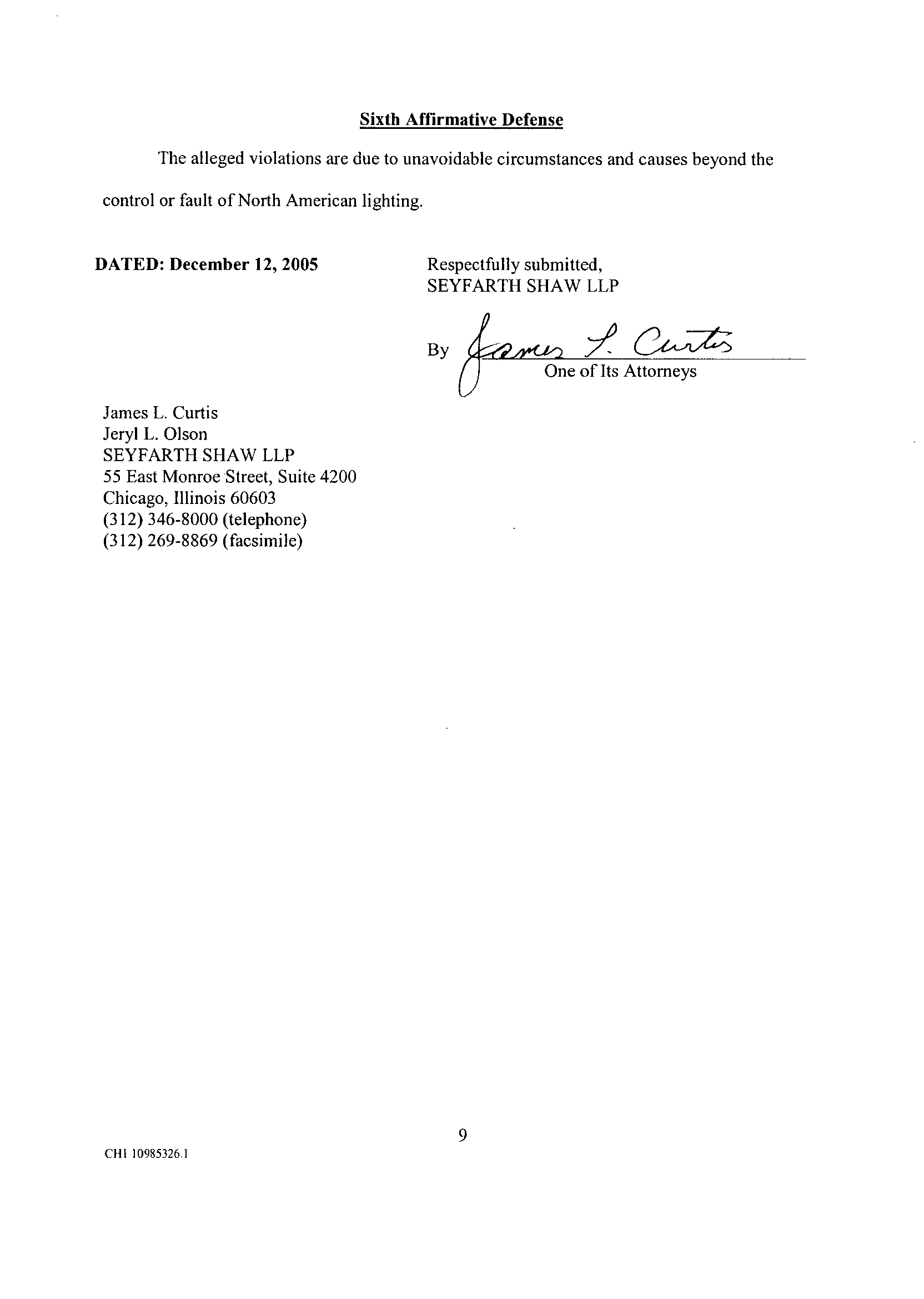 NOW COMES NORTH AMERICAN LIGHTING, INC ., by and through its attorneys,
