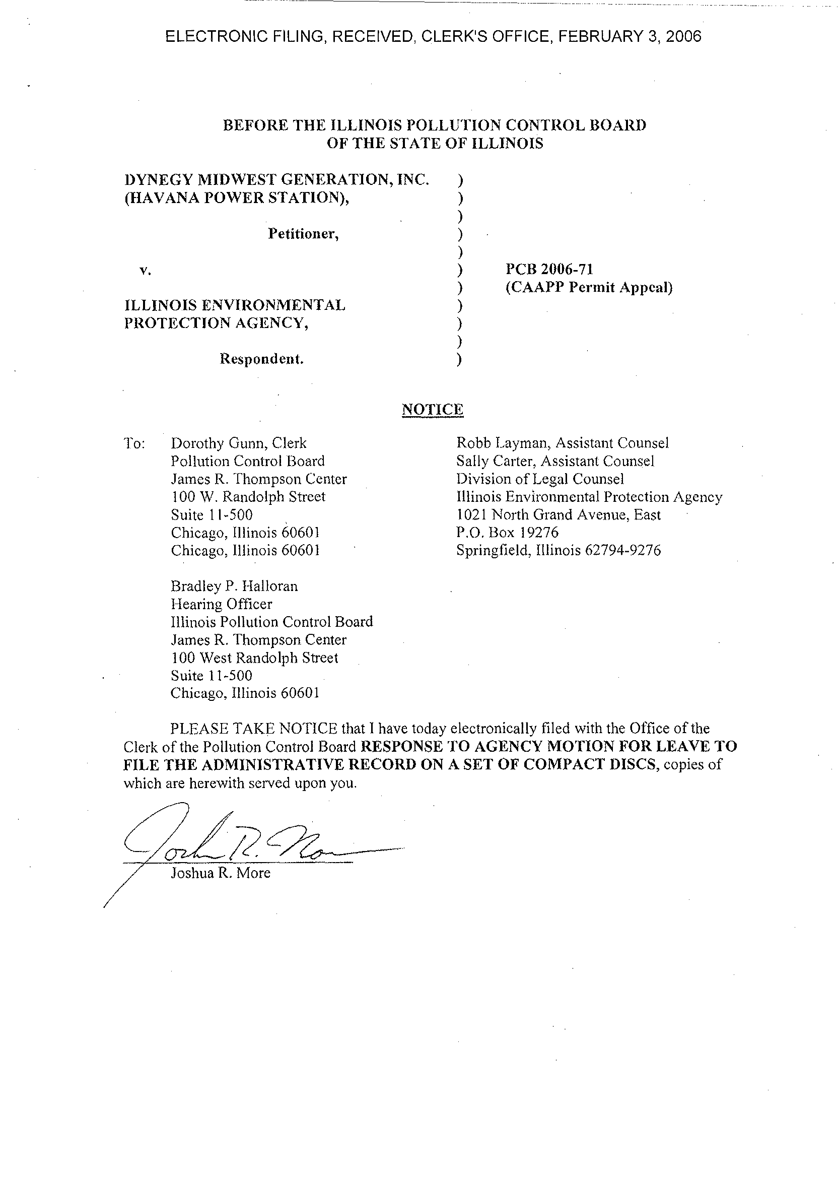 Clerk of the Pollution Control Board RESPONSE TO AGENCY MOTION FOR LEAVE TO