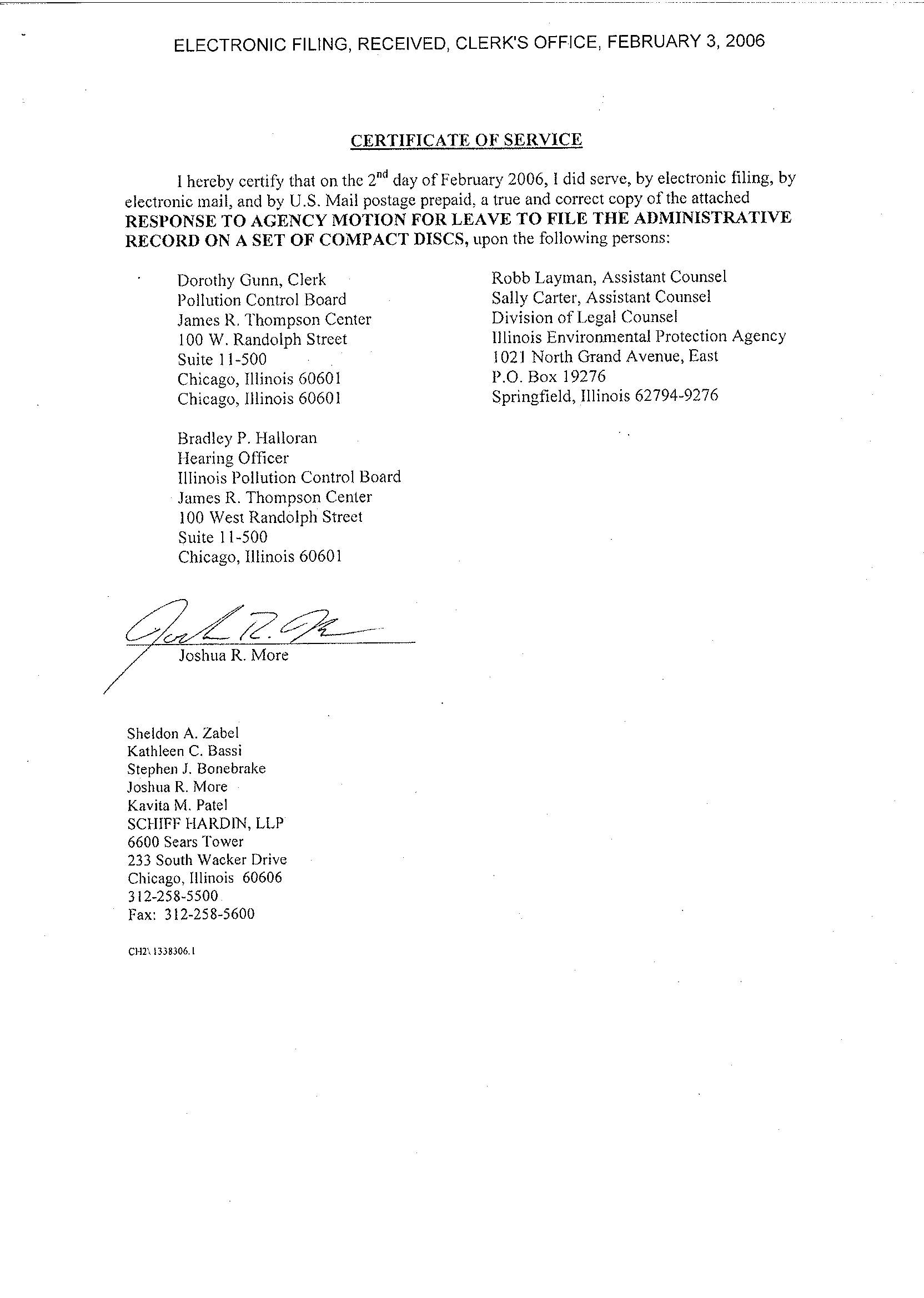 I hereby certify that on the 2 nd day of February 2006, 1 did serve, by electronic filing, by