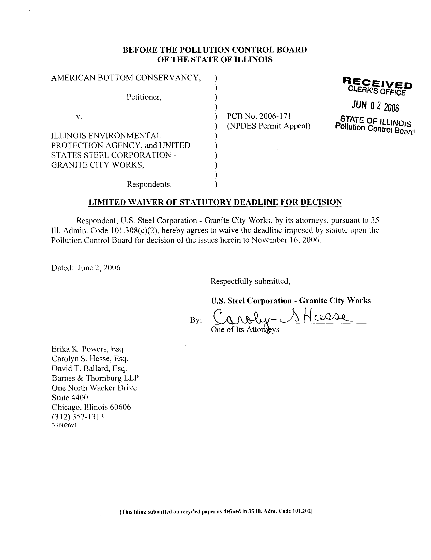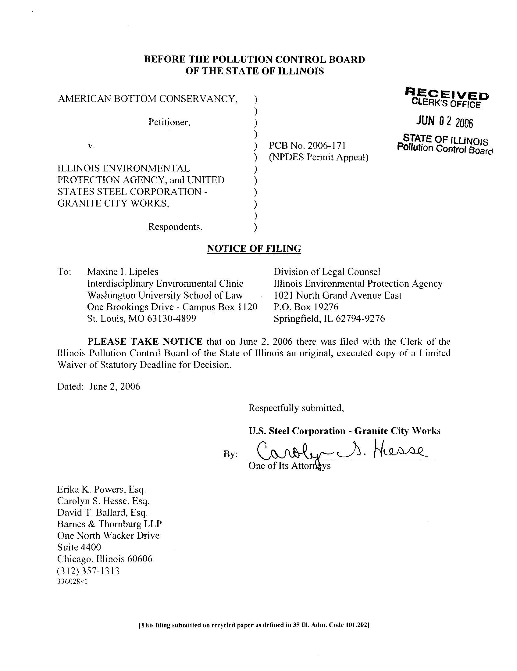 Illinois Pollution Control Board of the State of Illinois an original, executed copy of a Limited