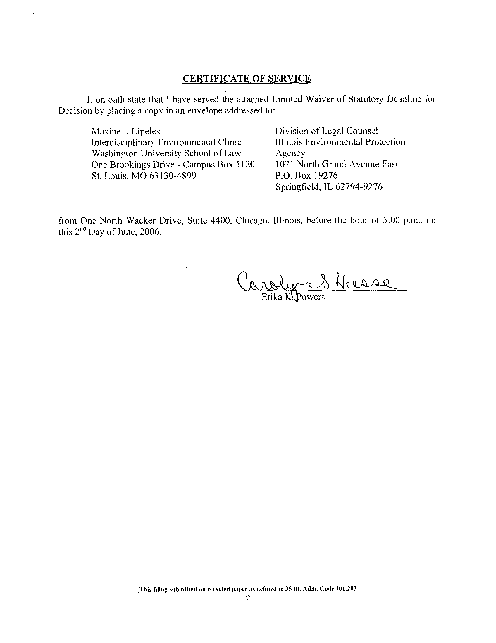 [This filing submitted on recycled paper as defined in 35111 . Adm . Code 101.2021