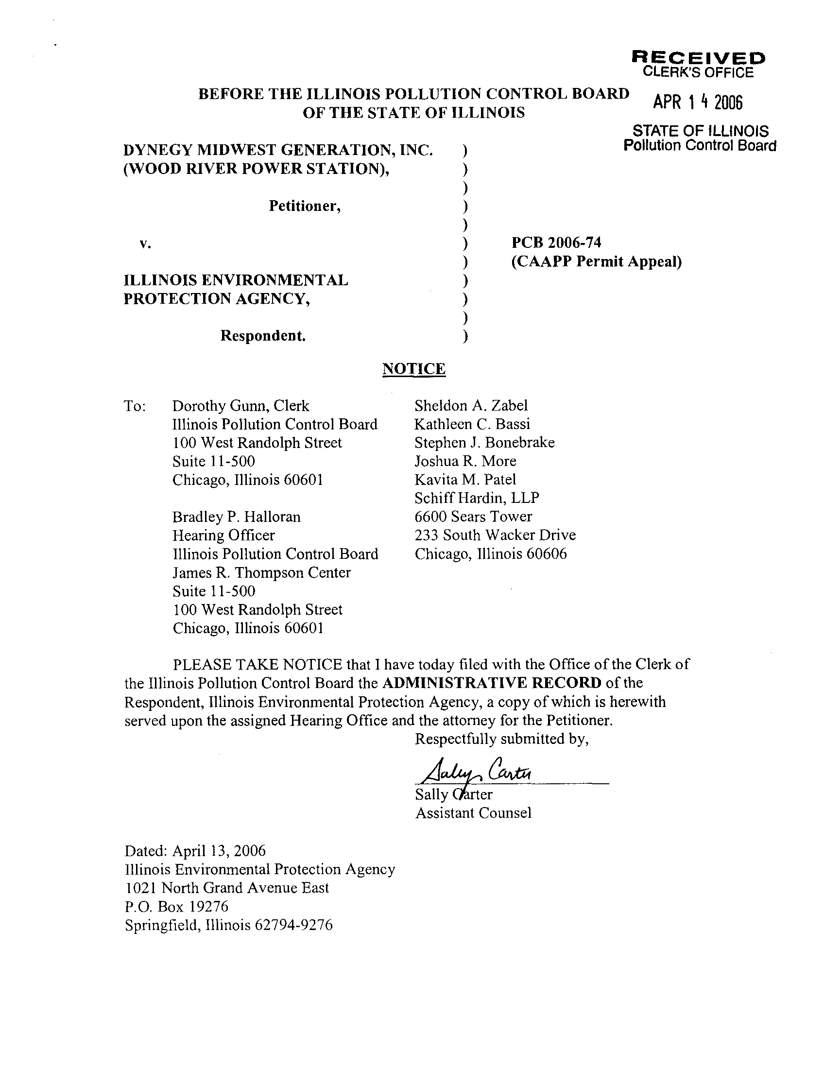 Respondent, Illinois Environmental Protection Agency, a copy of which is herewith