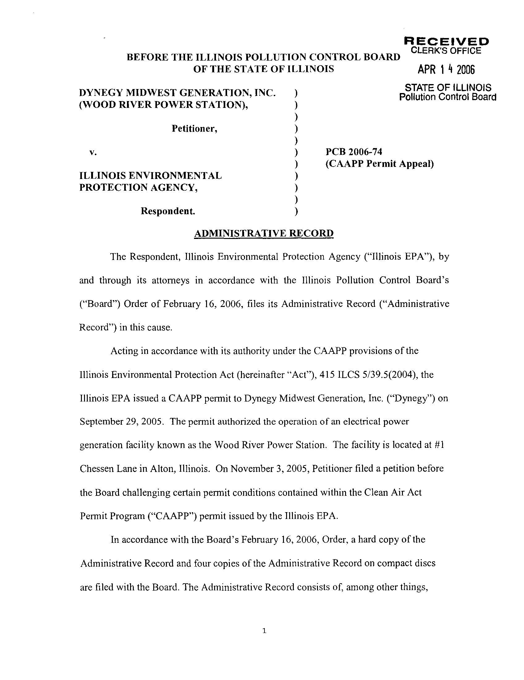 the Illinois Pollution Control Board the ADMINISTRATIVE RECORD of the