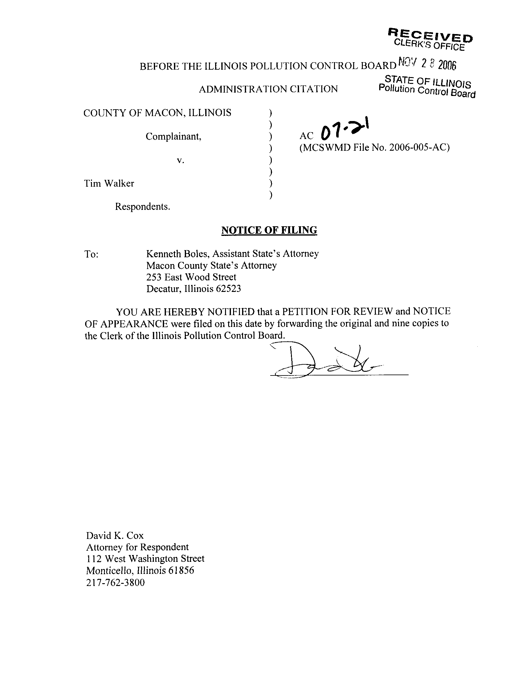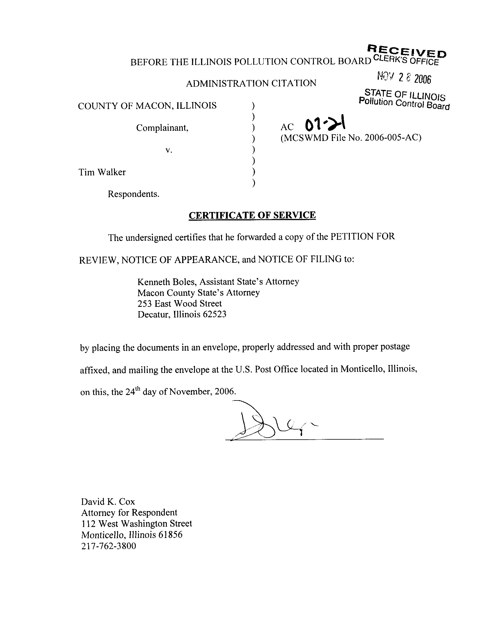 citation issued directly to the Respondent by Macon County has been completed,