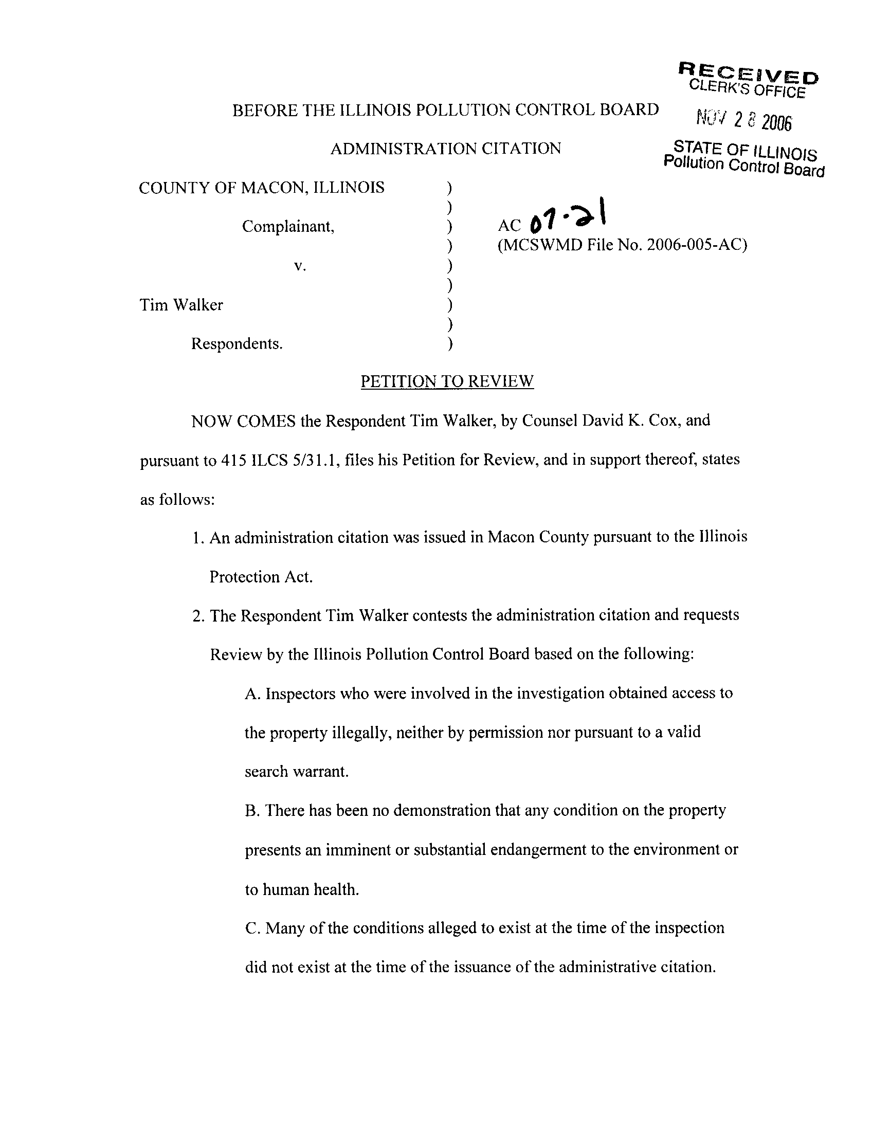 pursuant to 415 ILCS 5/31 .1, files his Petition for Review, and in support thereof, states