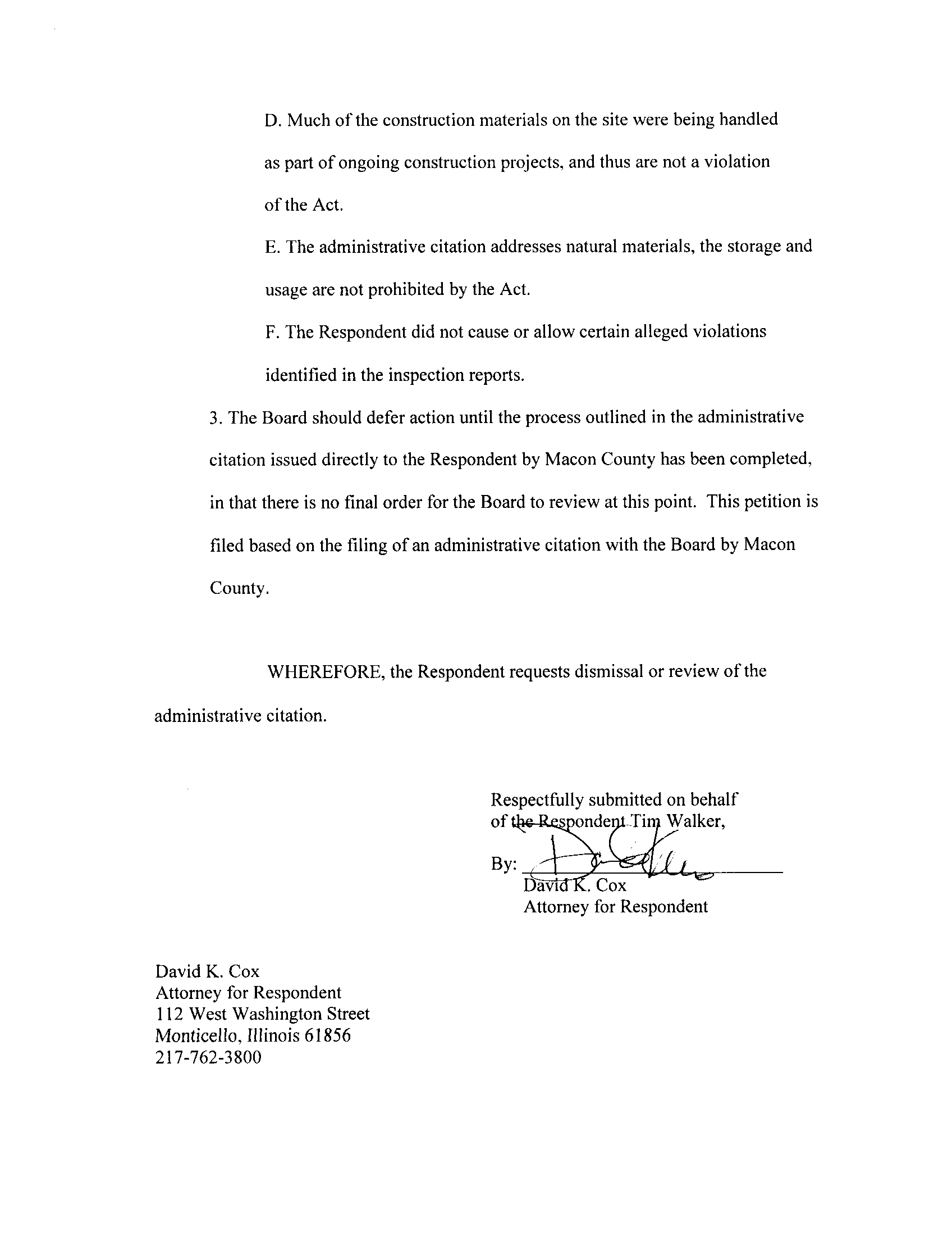 NOW COMES the Respondent Tim Walker, by Counsel David K