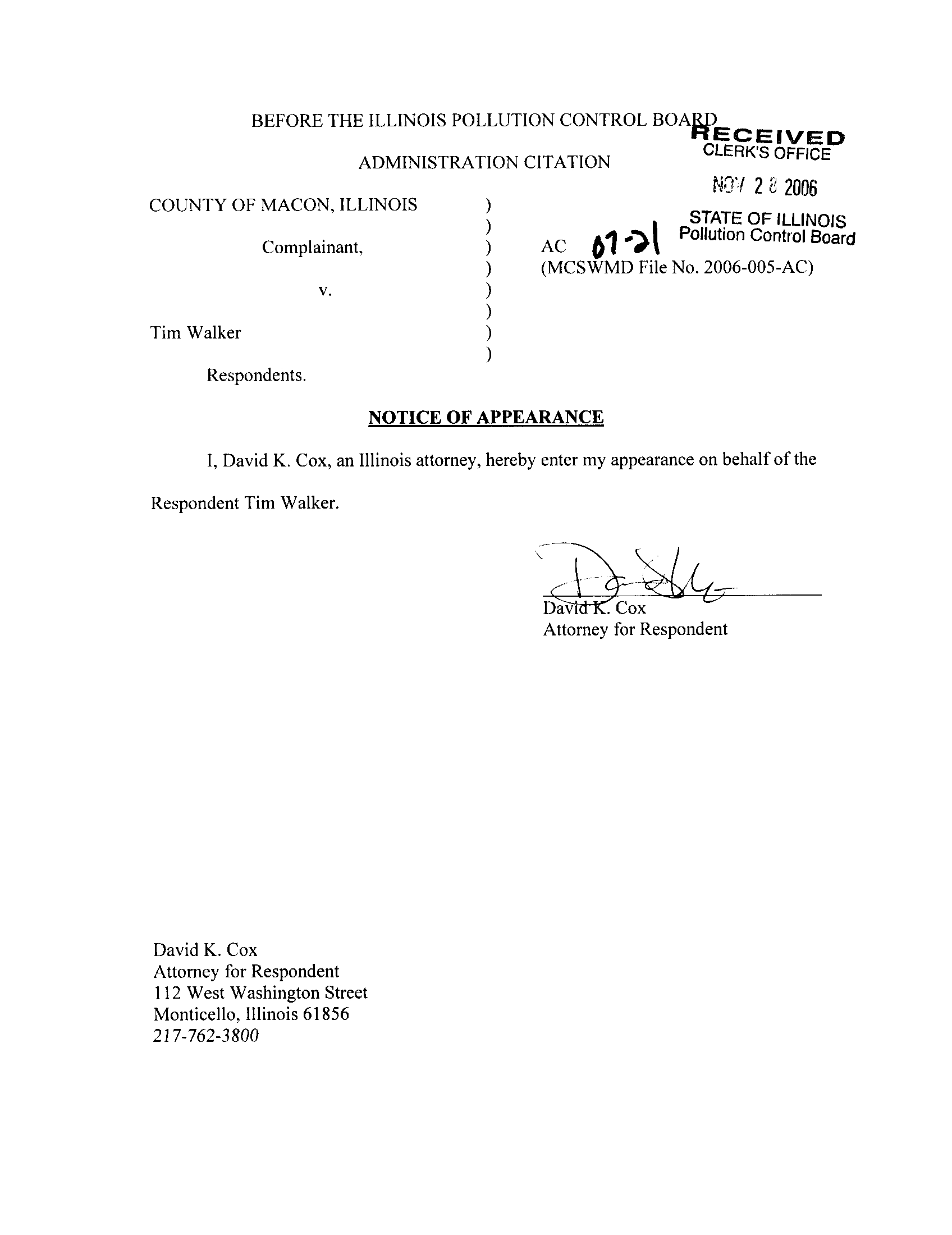 I, David K . Cox, an Illinois attorney, hereby enter my appearance on behalf of the