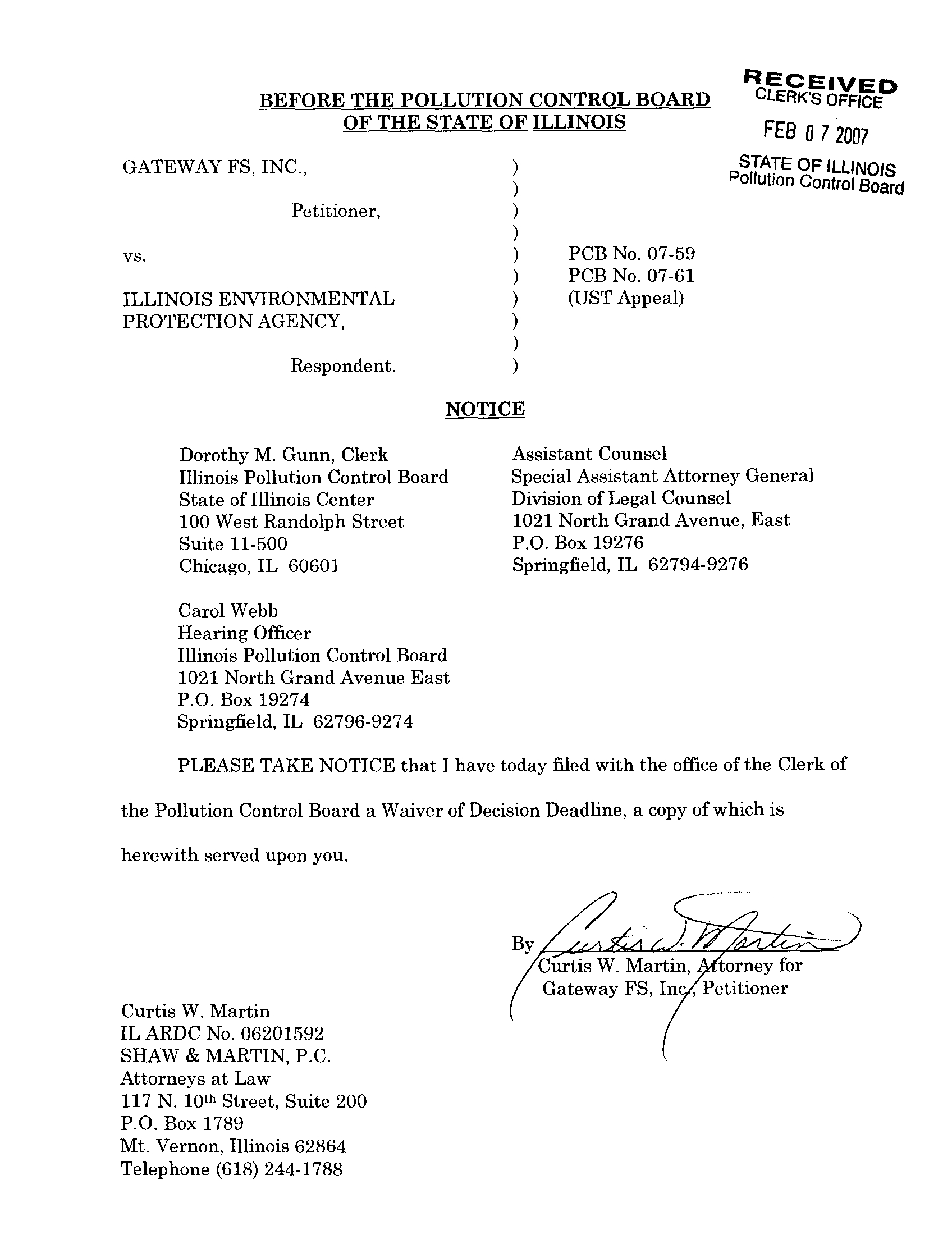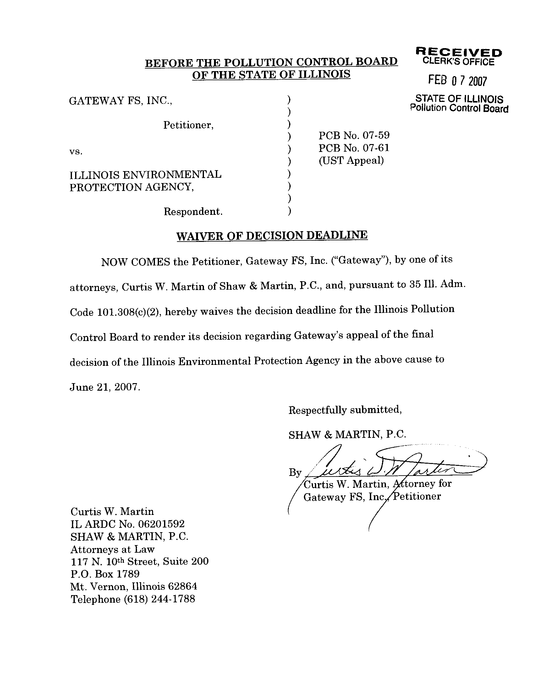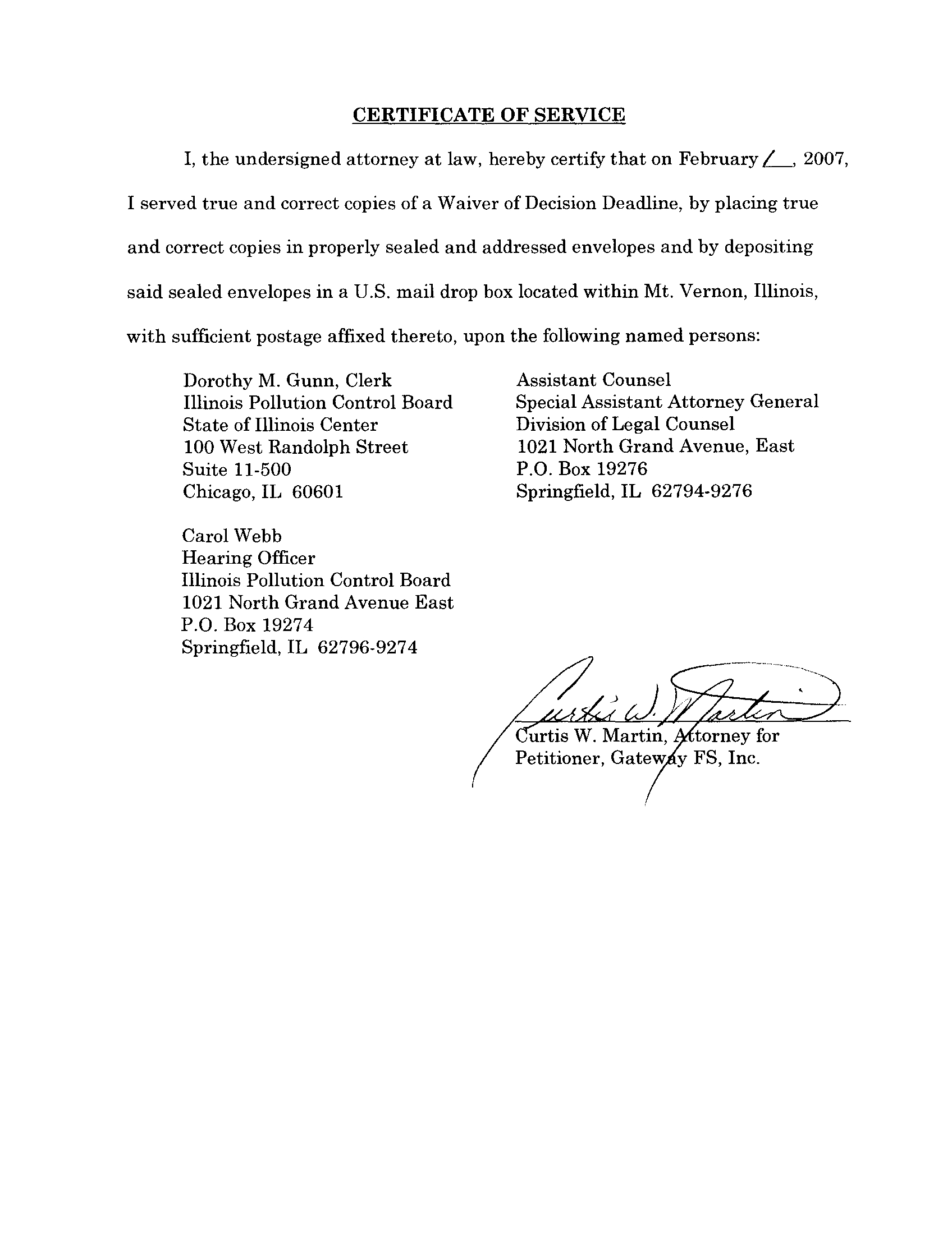 the Pollution Control Board a Waiver of Decision Deadline, a copy of which is