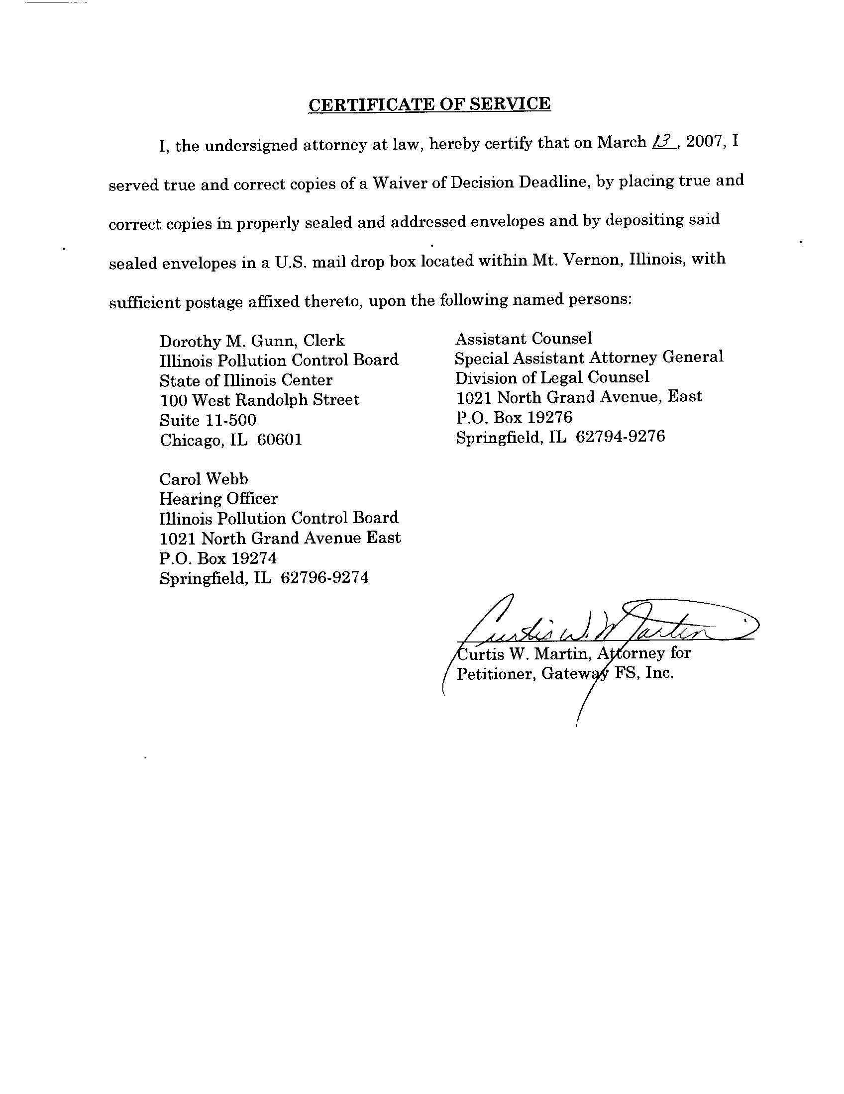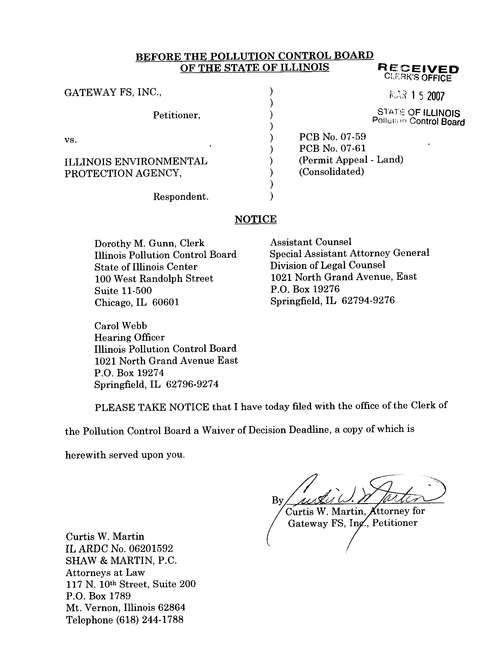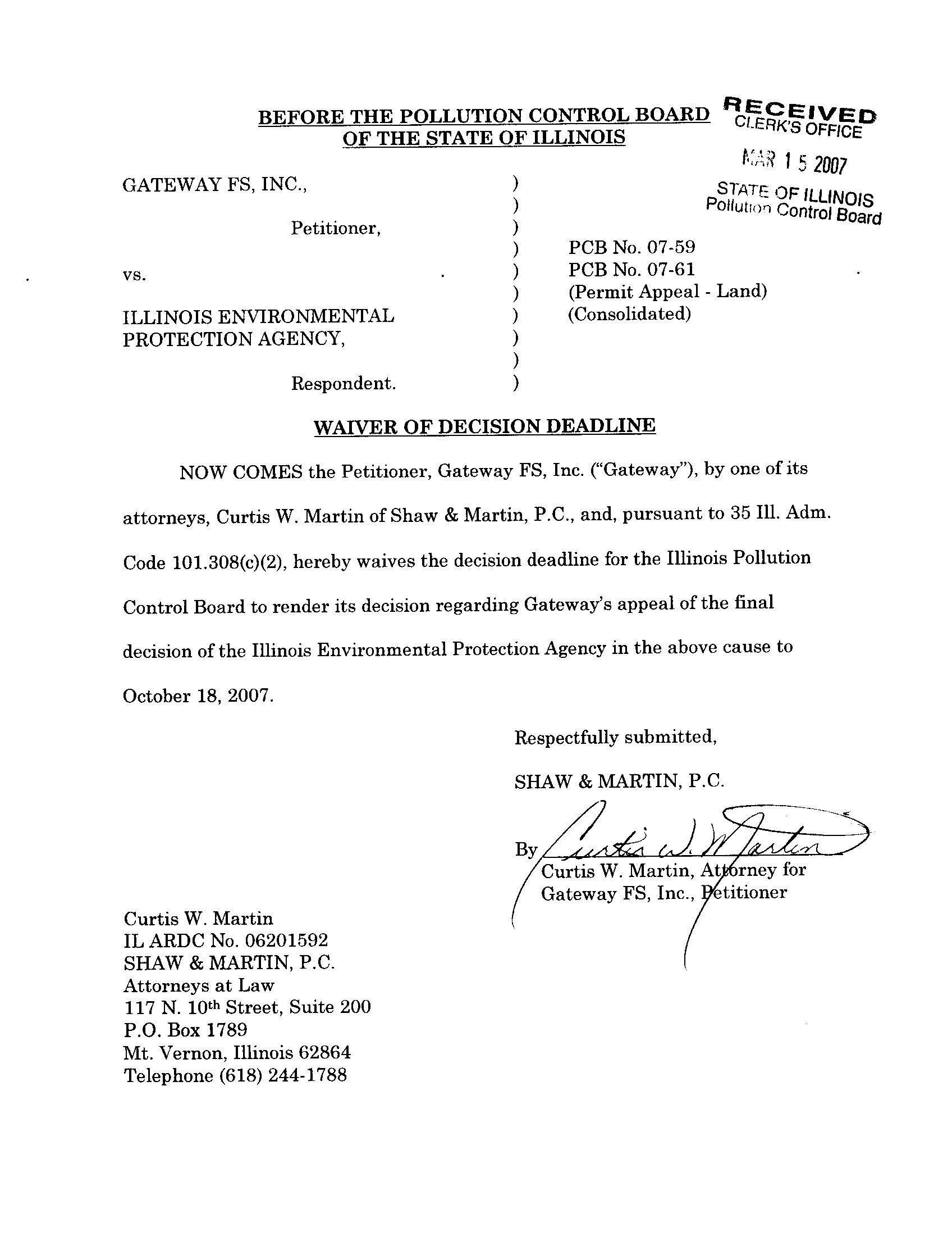 the Pollution Control Board a Waiver of Decision Deadline, a copy of which is