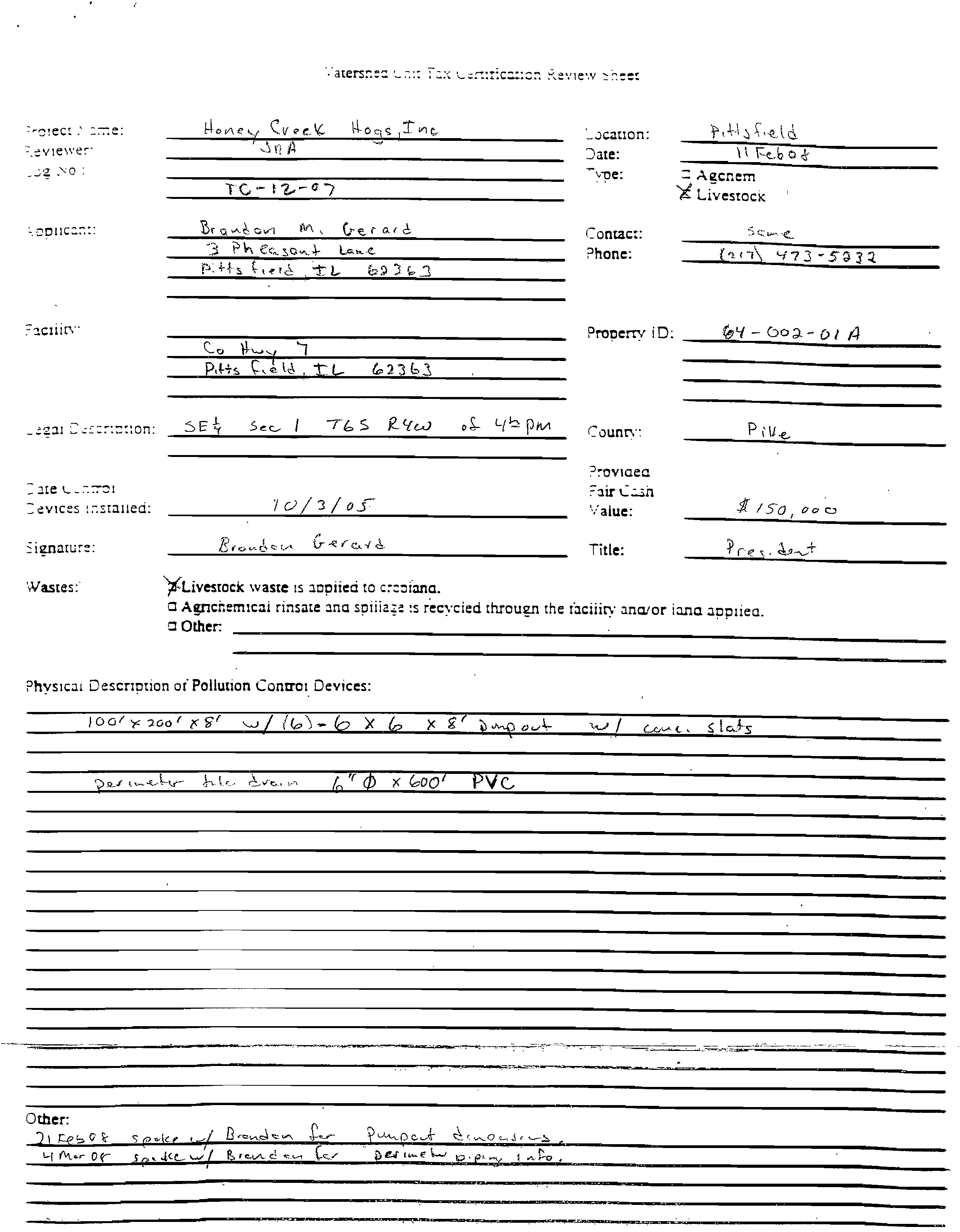 On July 16, 2007, the Illinois EPA received a request from Honey Creek Hogs,