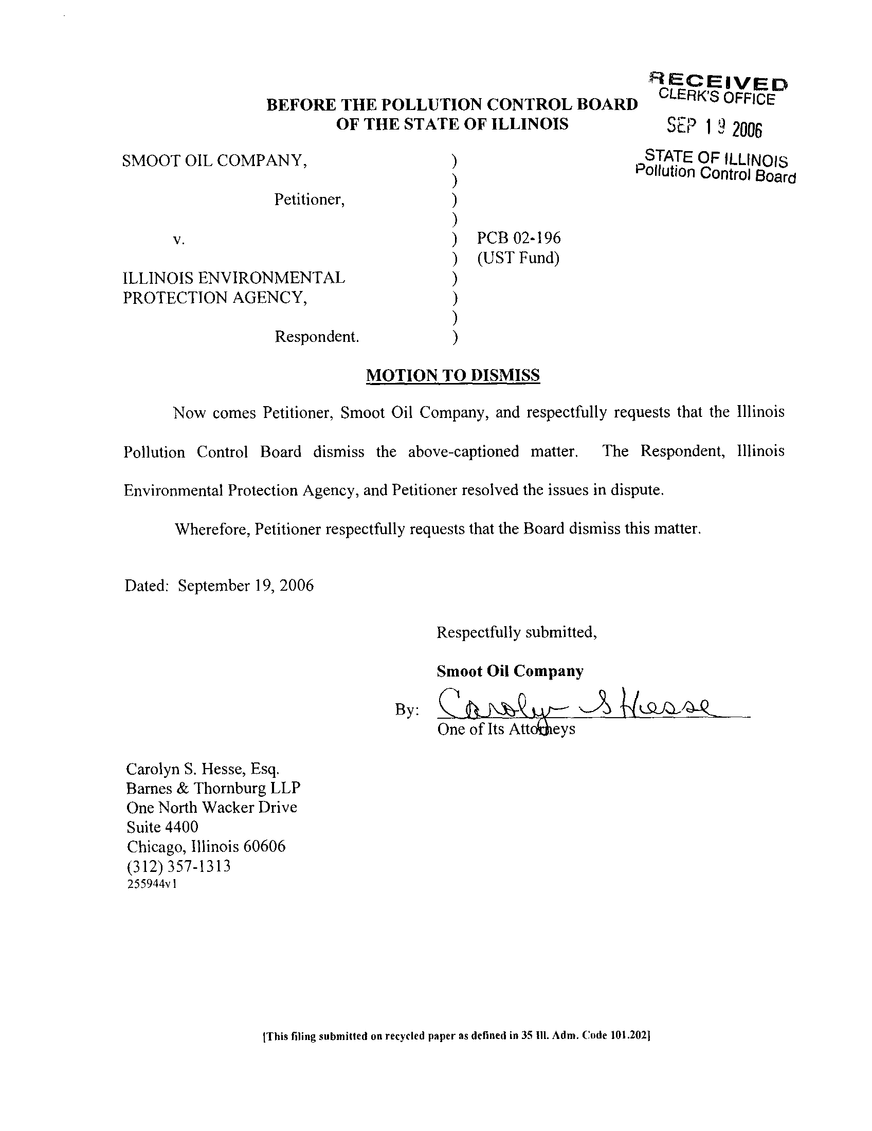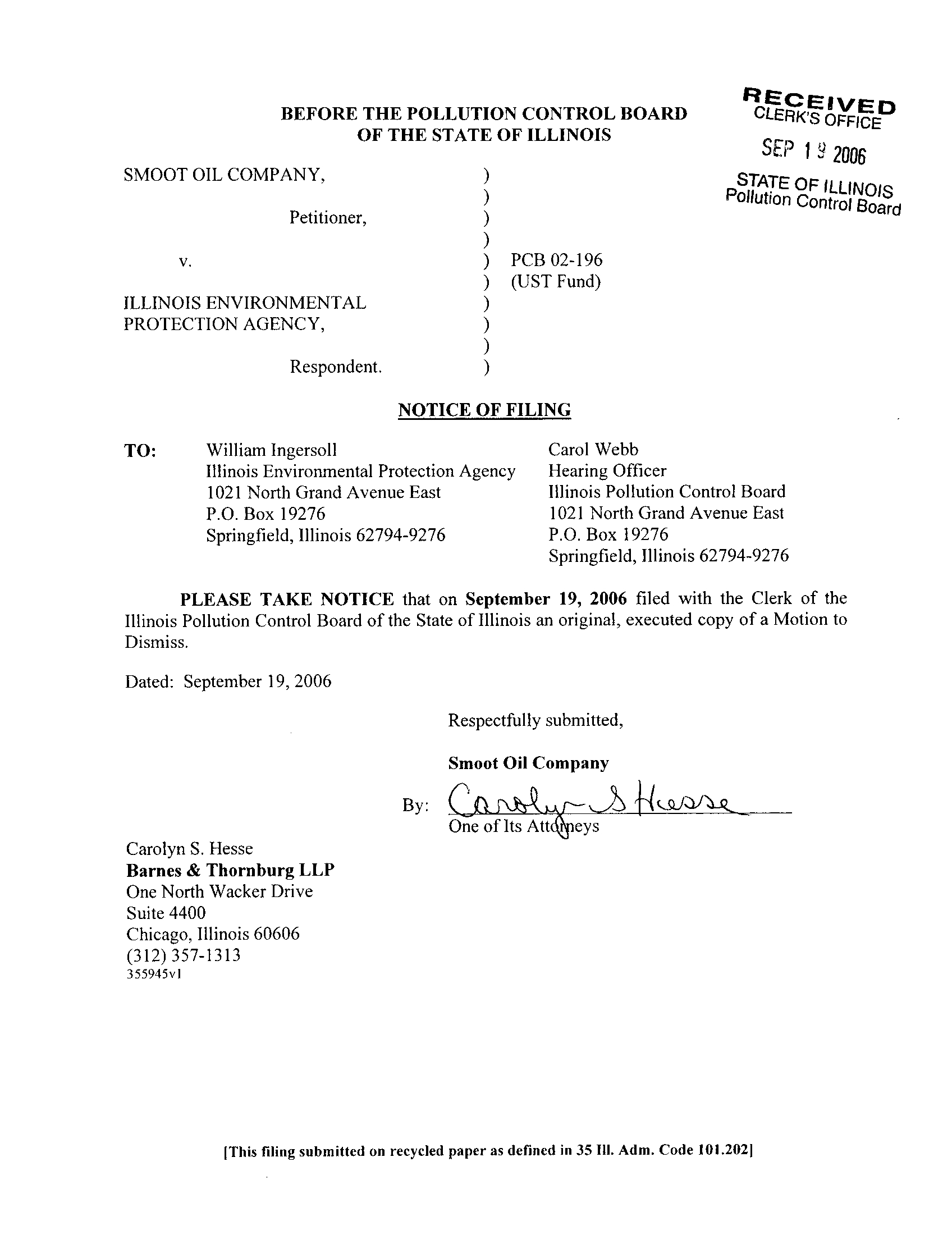 Illinois Pollution Control Board of the State of Illinois an original, executed copy of a Motion to