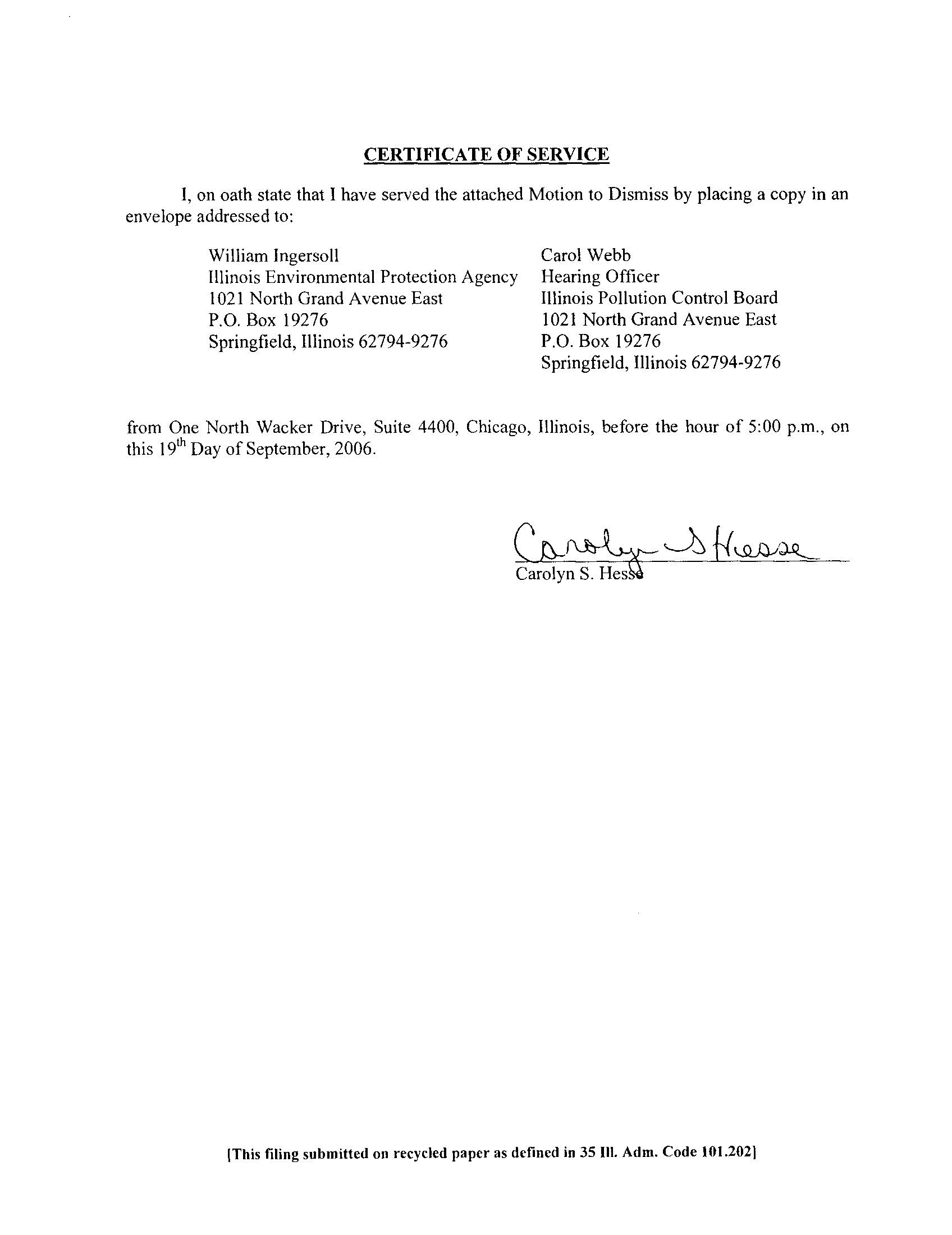 (This filing submitted on recycled paper as defined in 35 I11 . Adm . Code 101