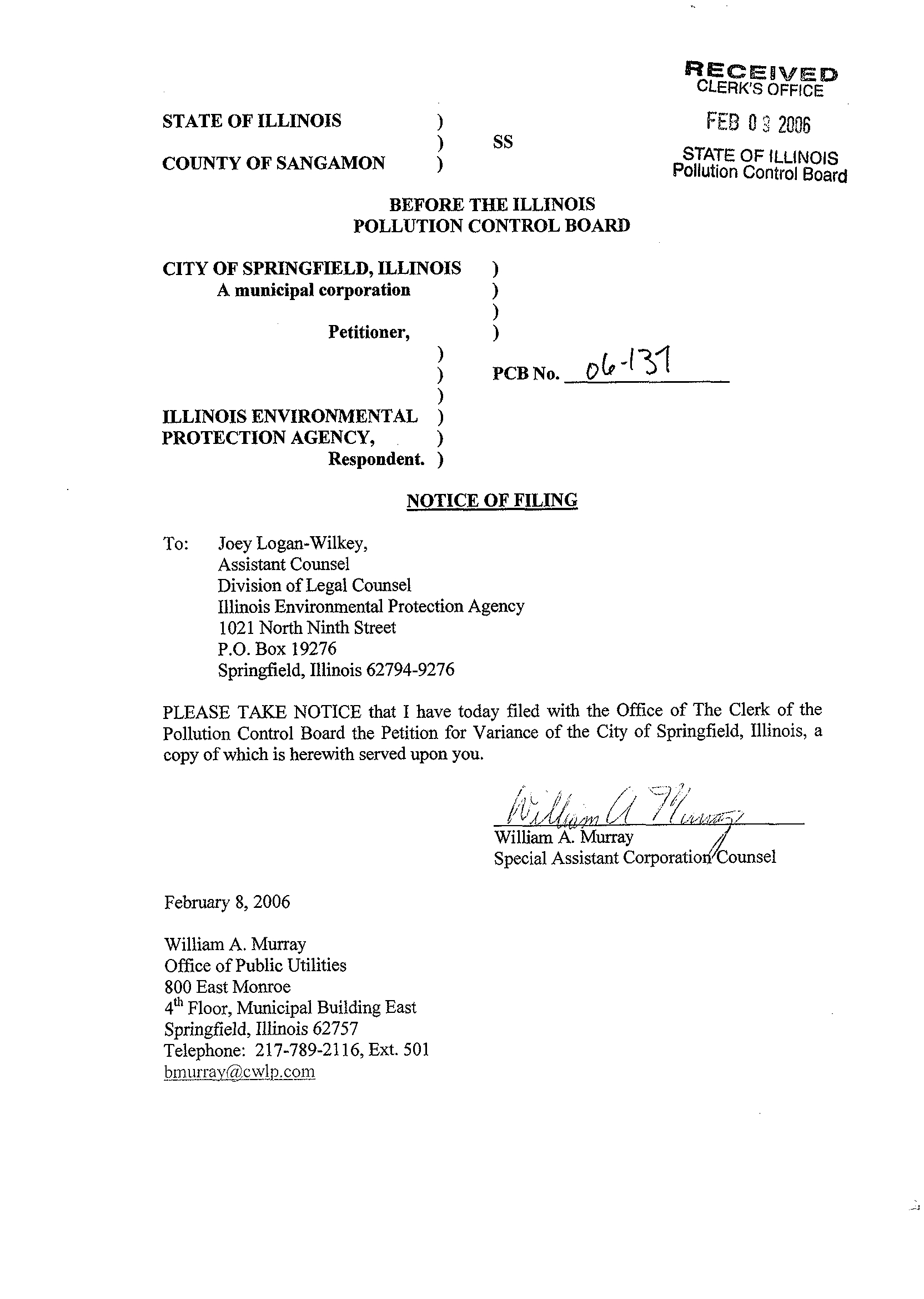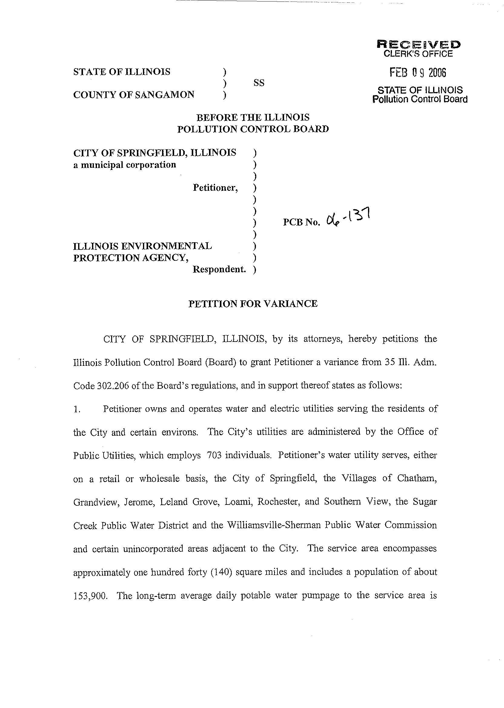 Pollution Control Board the Petition for Variance of the City of Springfield,