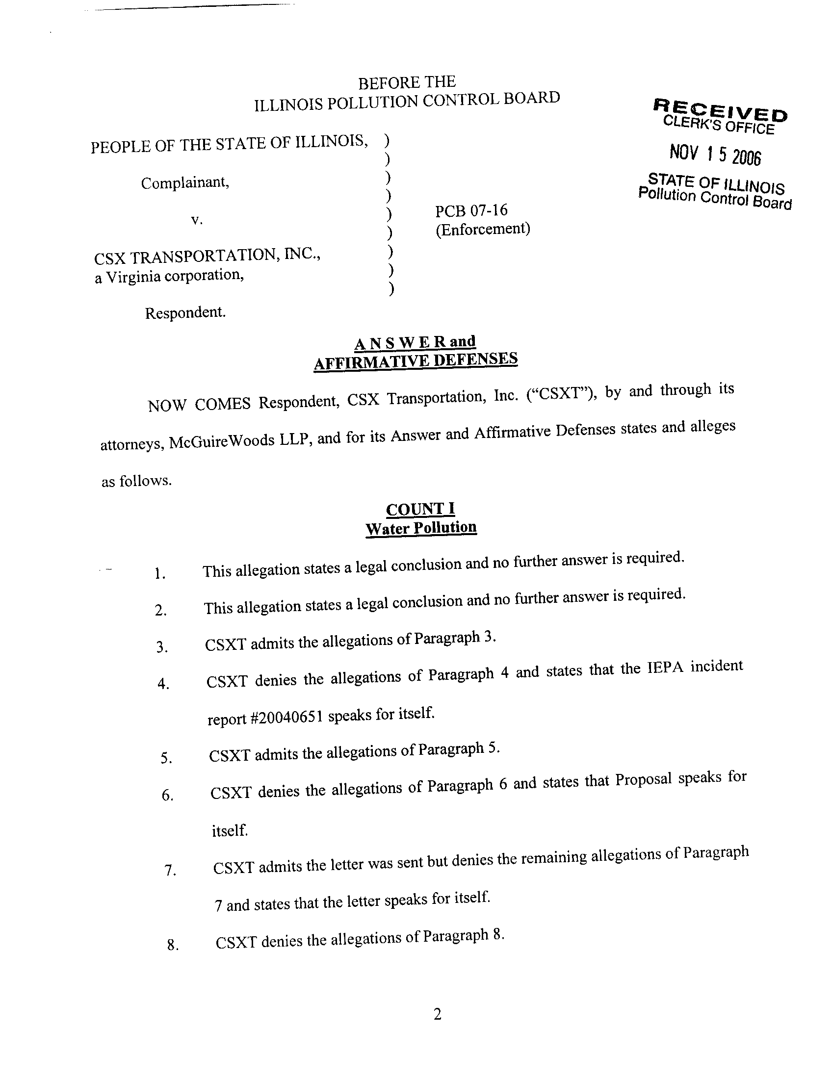 the Pollution Control Board the RESPONDENT'S ANSWER and AFFIRMATIVE DEFENSES
