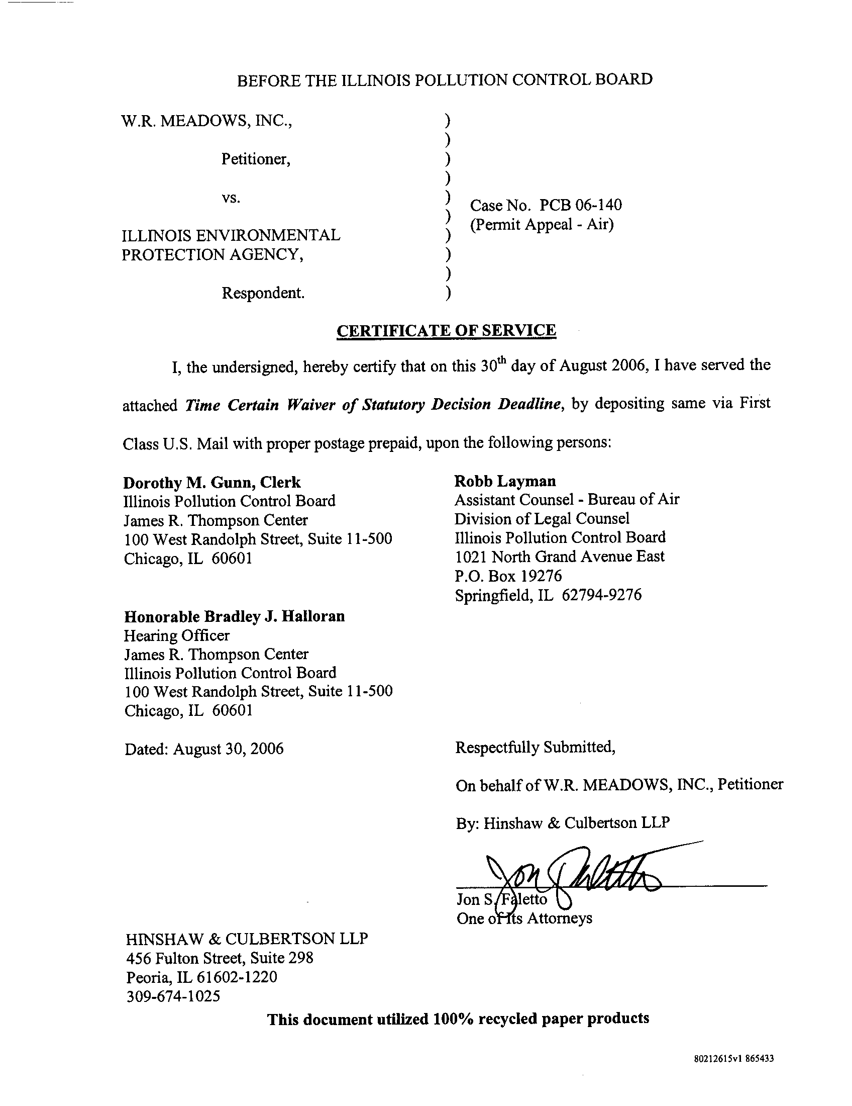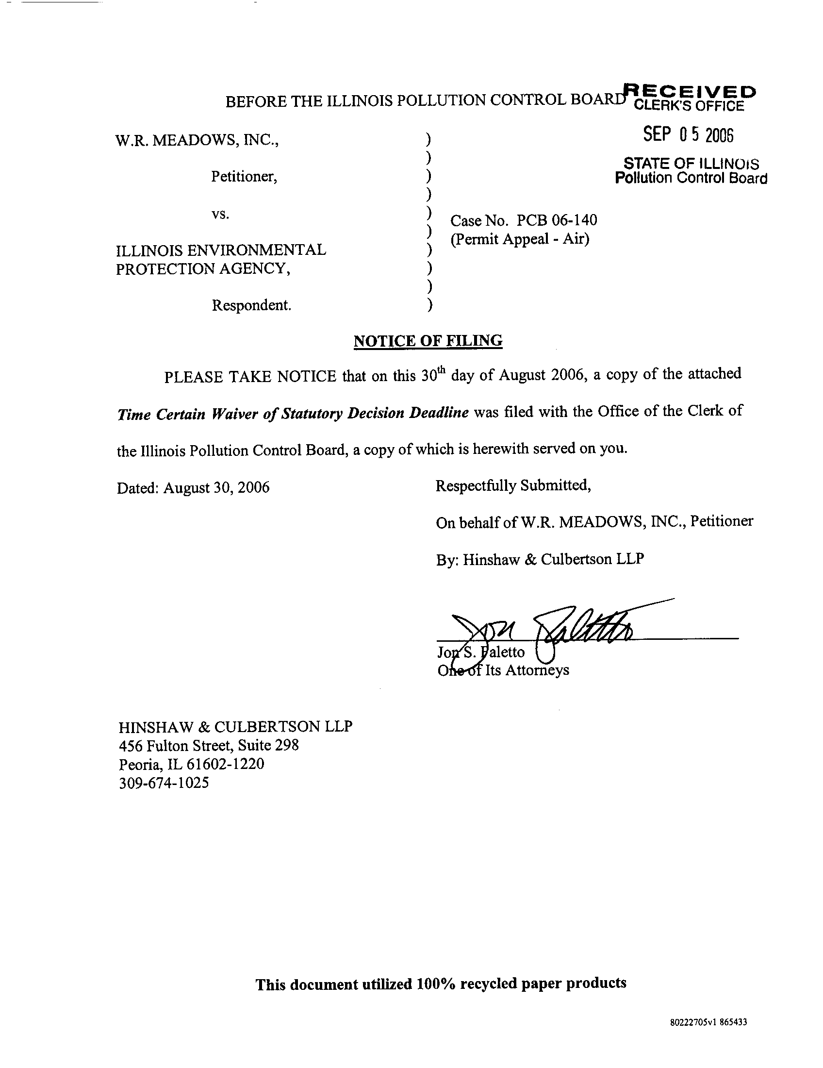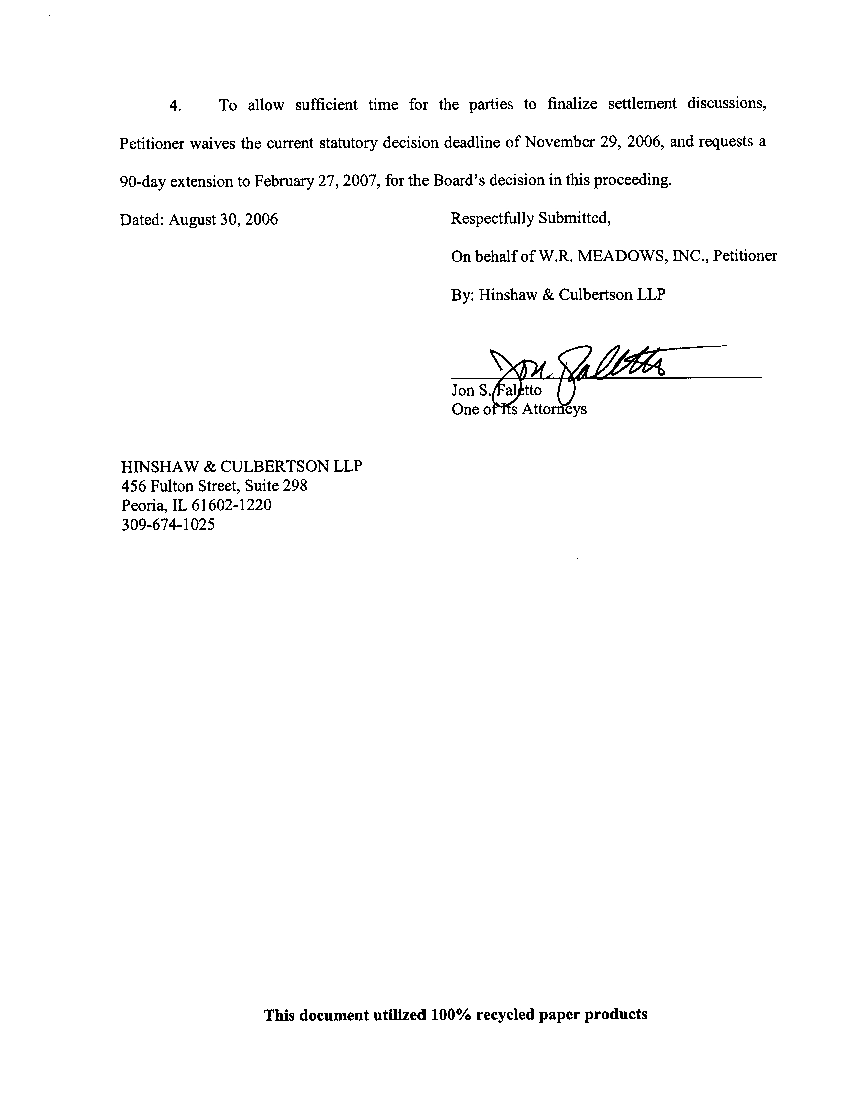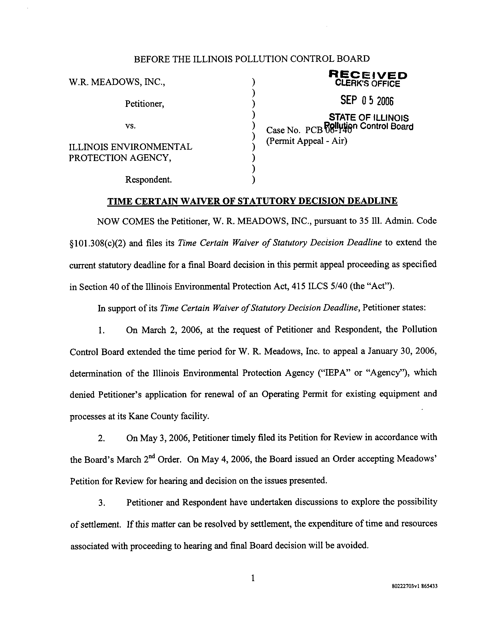 NOW COMES the Petitioner, W. R. MEADOWS, INC ., pursuant to 35 Ill . Admin. Code