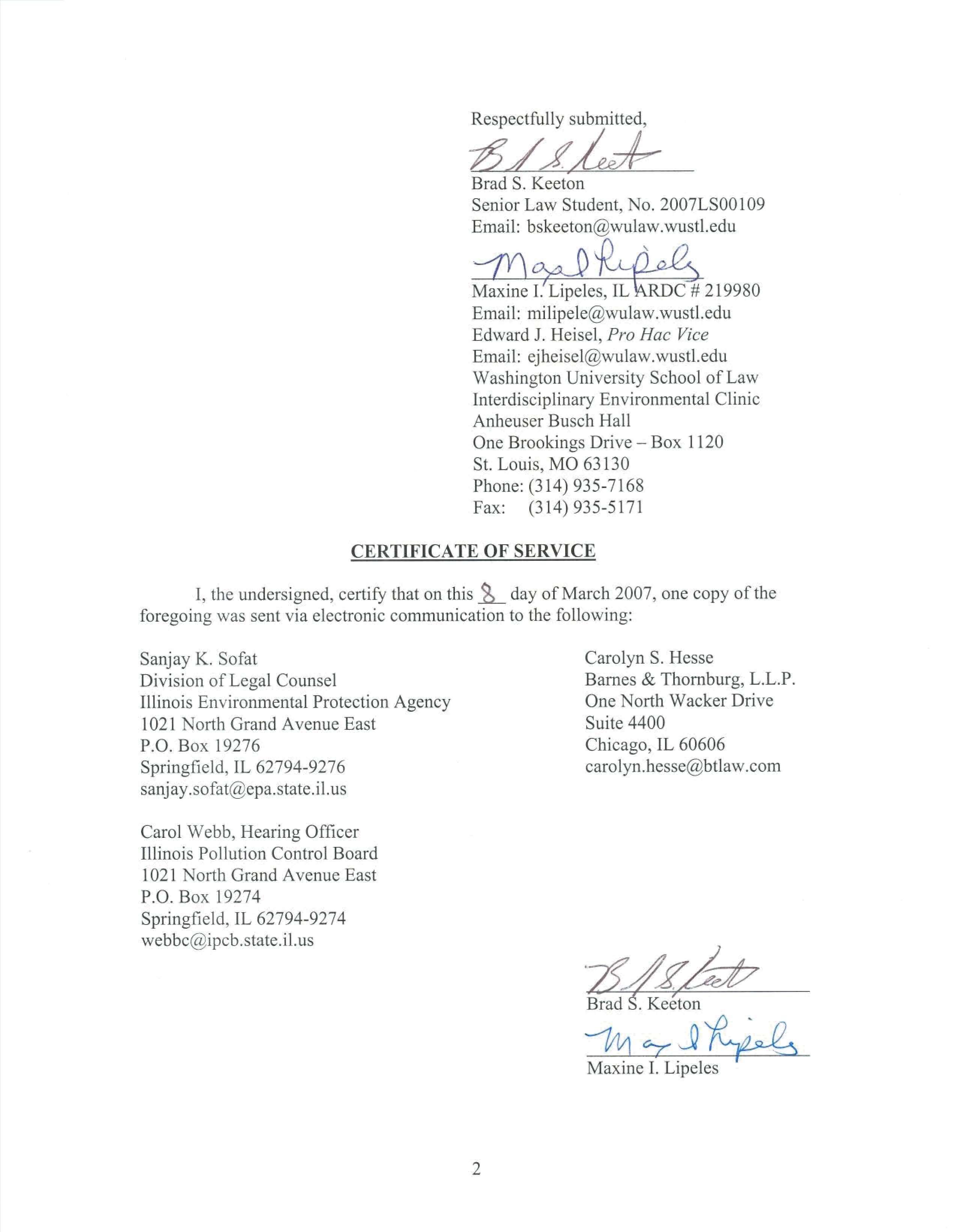 the Illinois Pollution Control Board of the State of Illinois an original, executed copy of