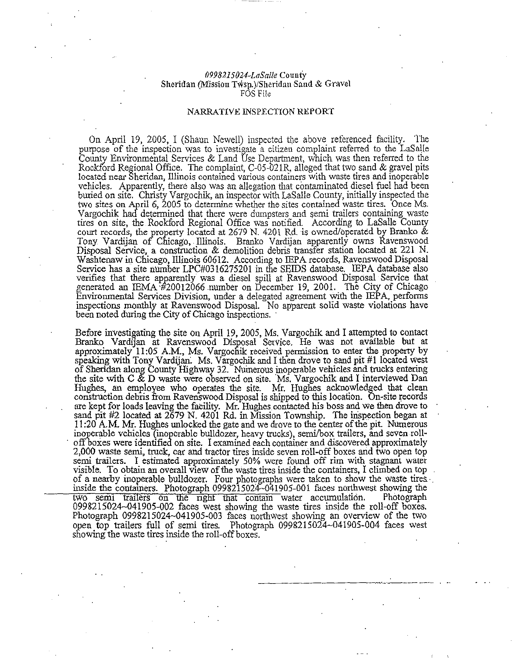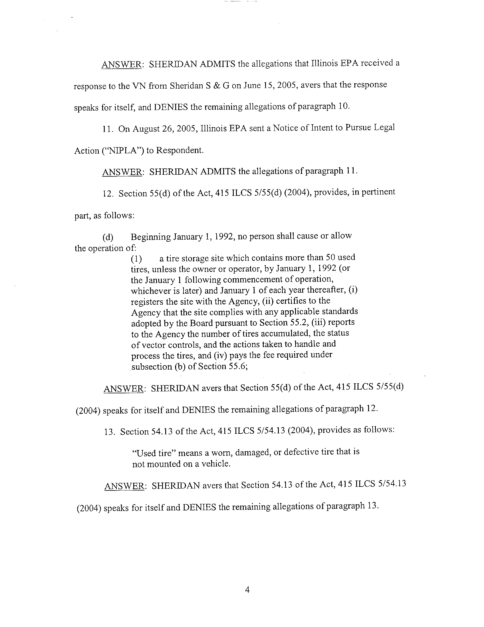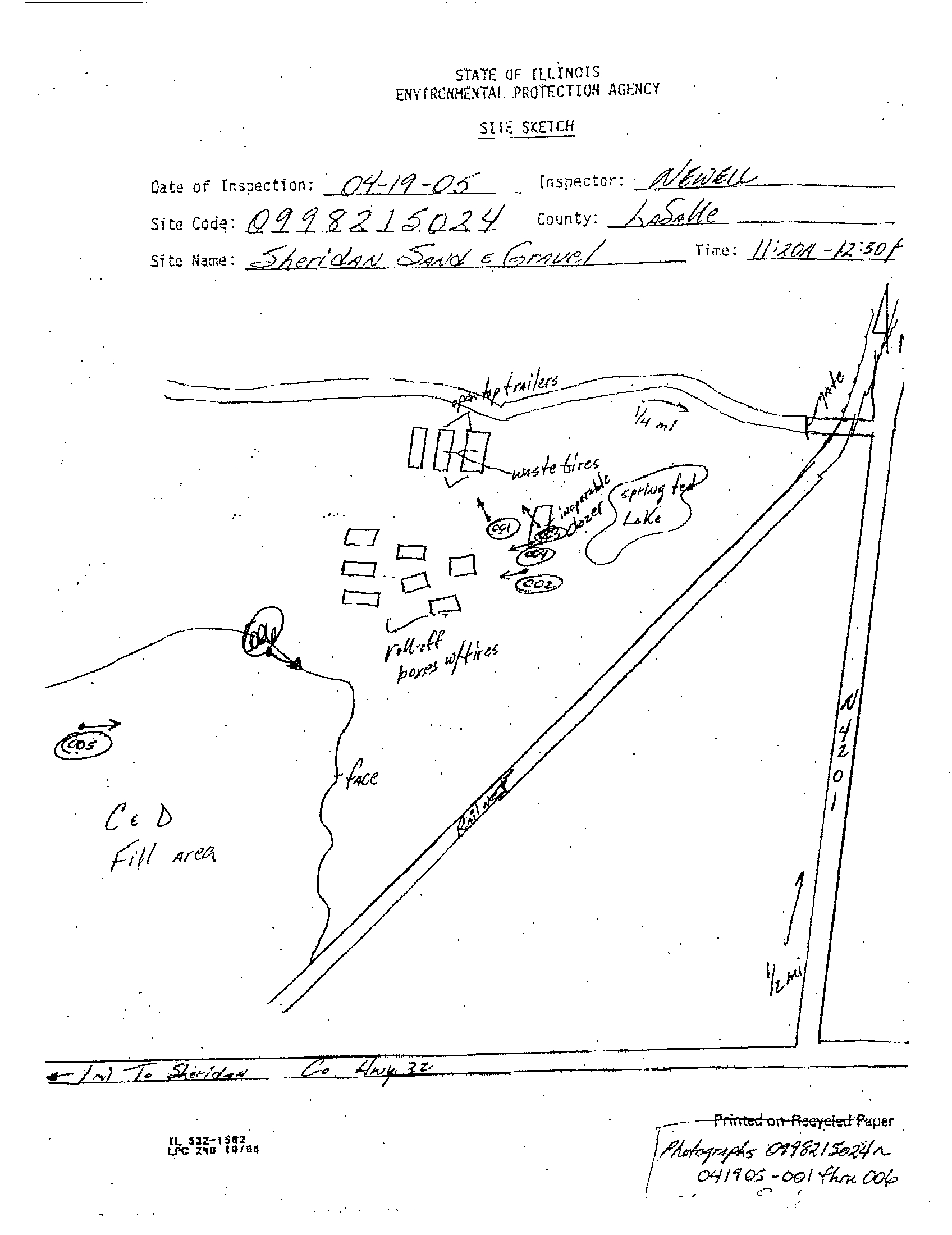approximately April 19, 2005, the Illinois EPA conducted a tire storage inspection at the Sheridan