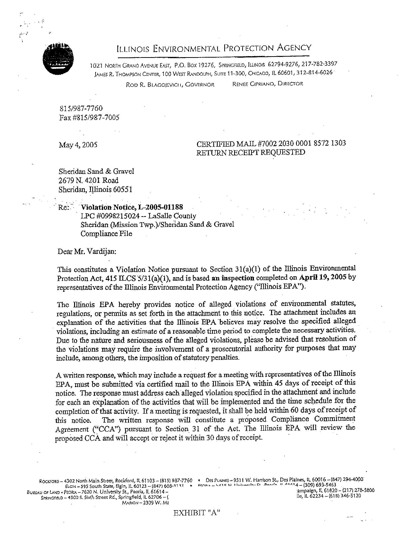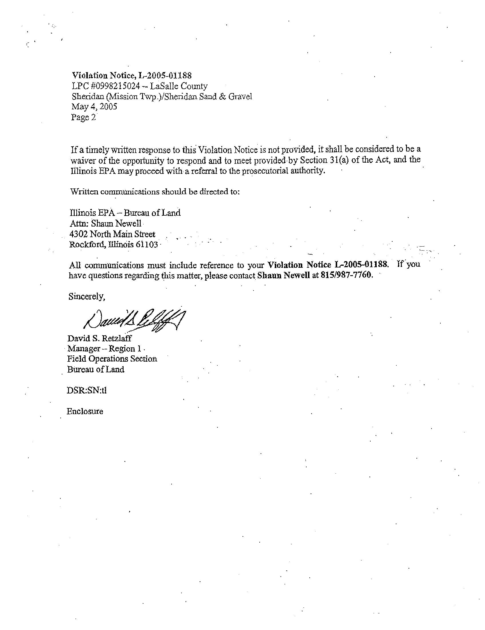 the Illinois EPA issued violation notice number L-2005-01188 to Sheridan Sand and Gravel pursuant