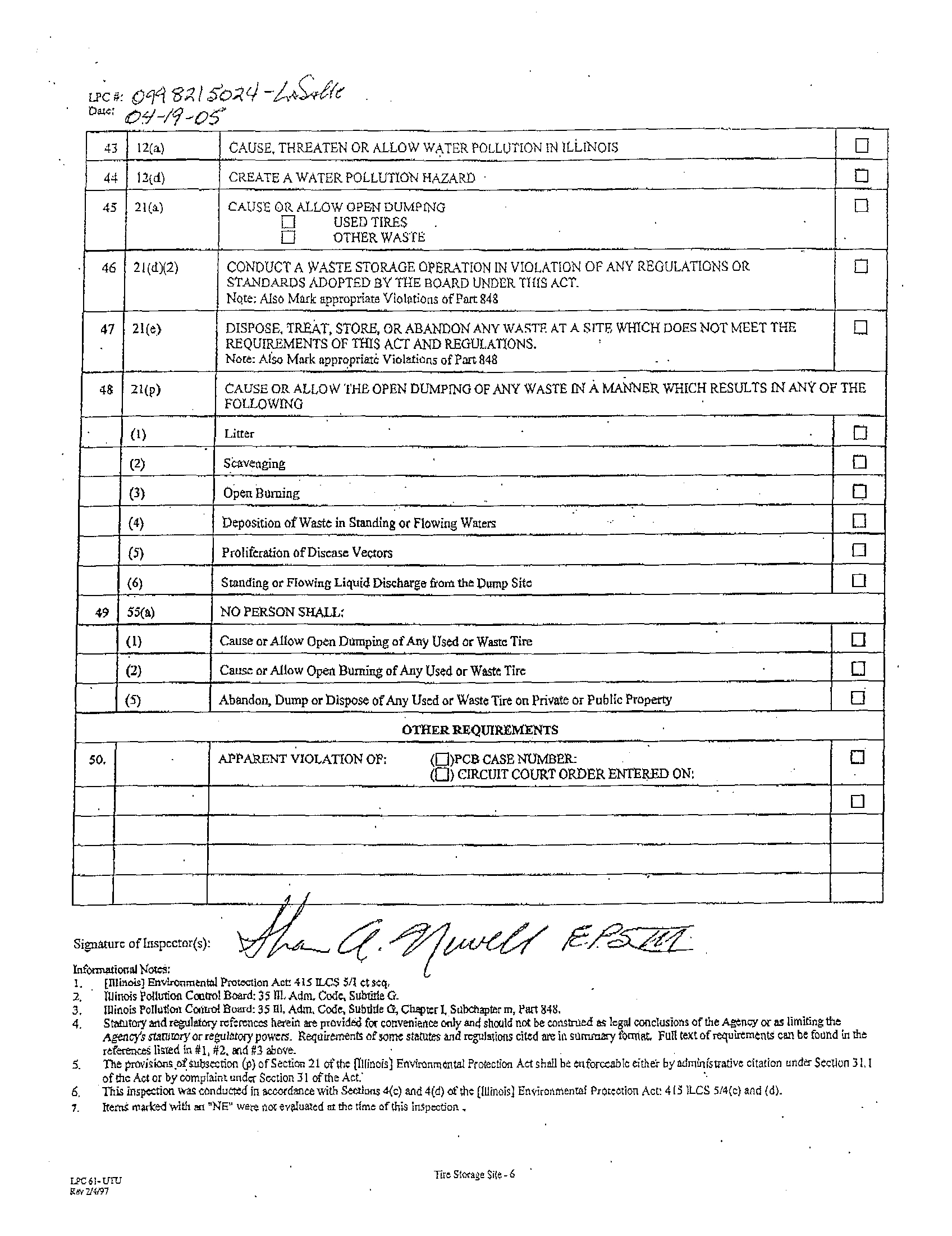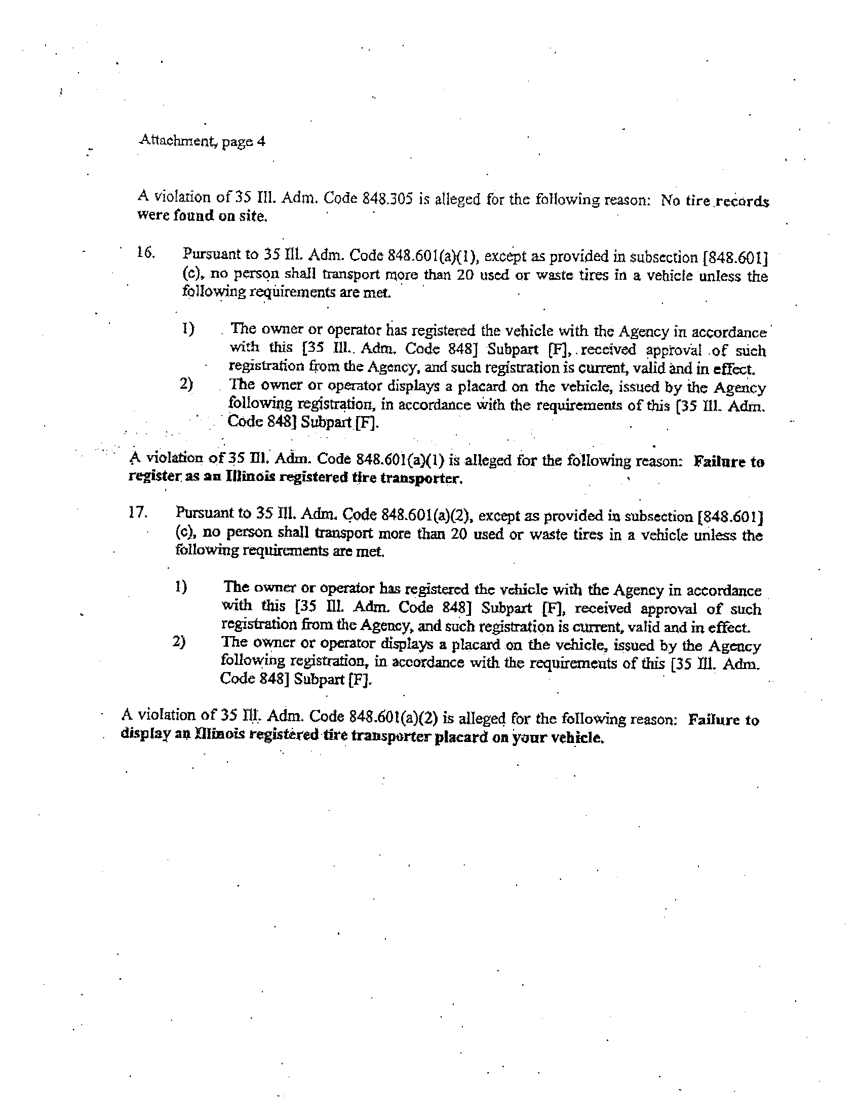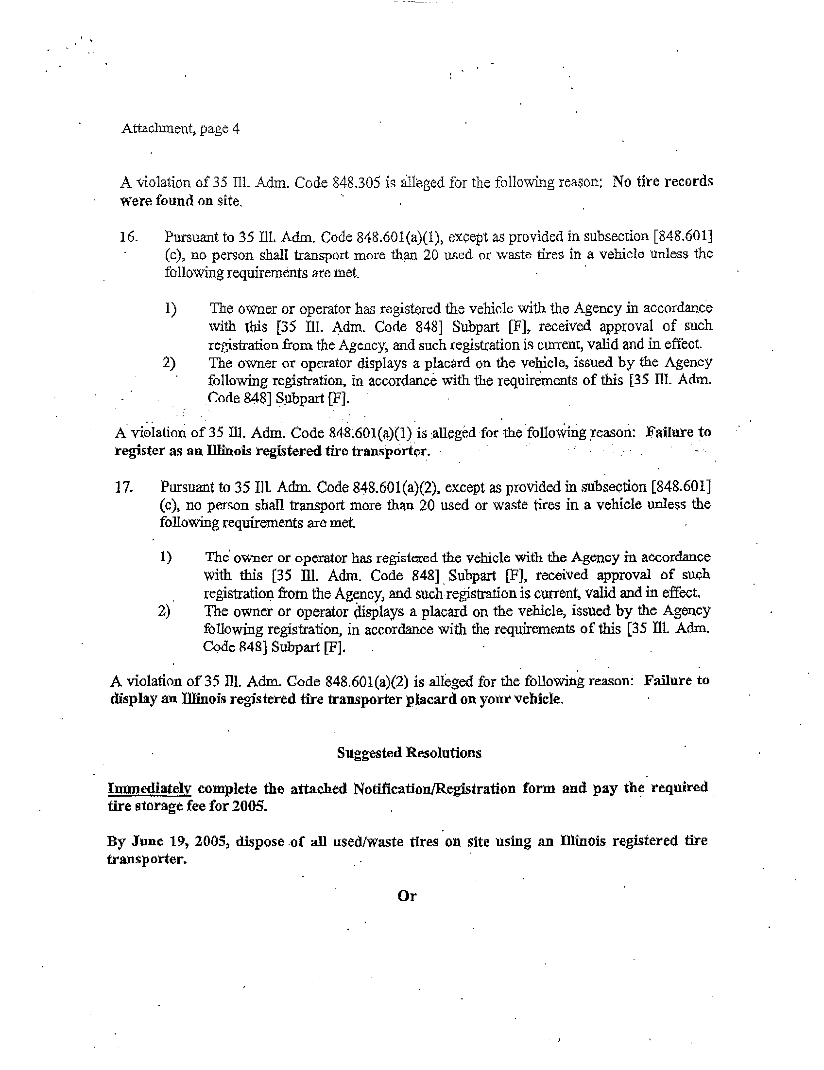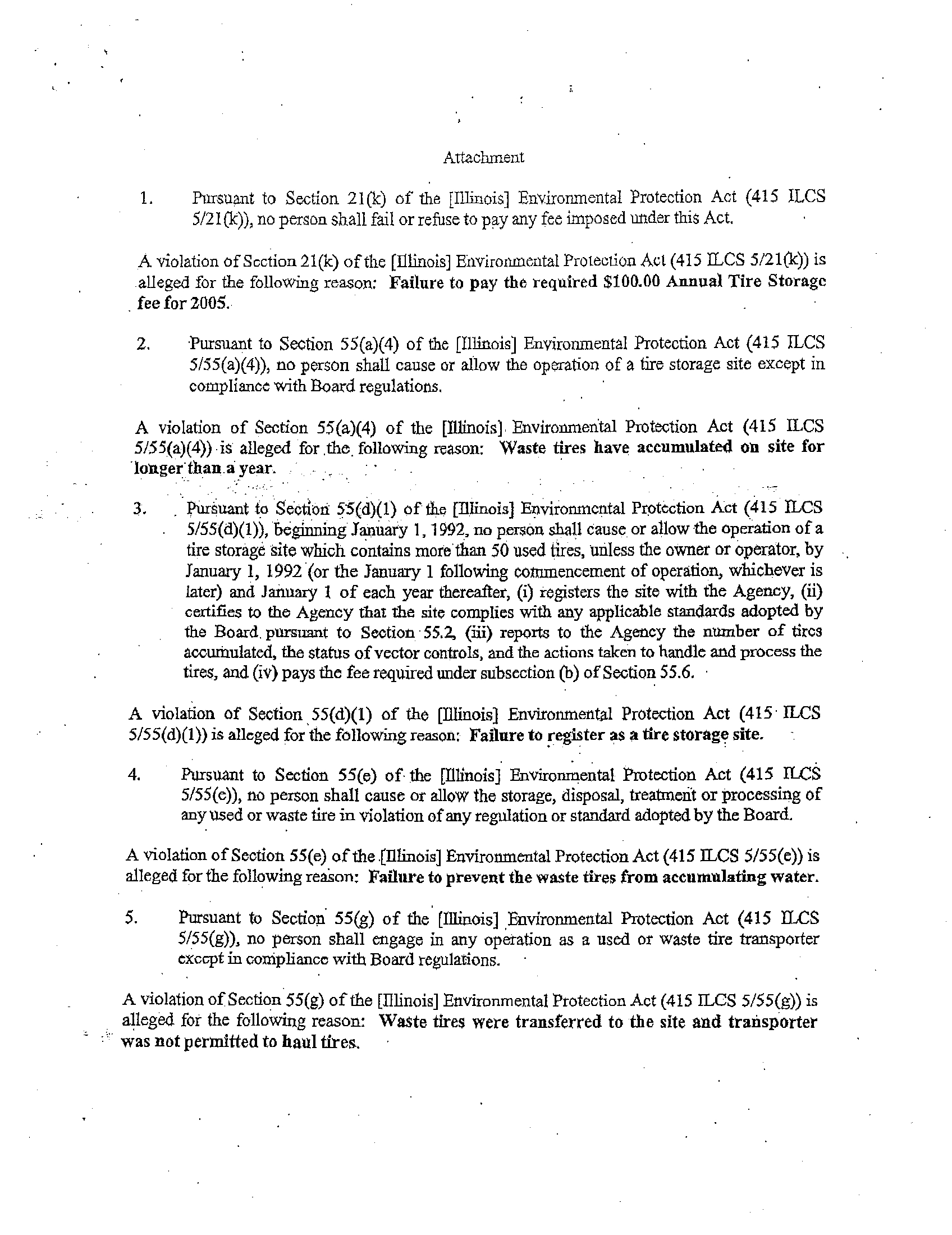 inspection, the Illinois EPA observed approximately 2000 used/waste tires at the site, which