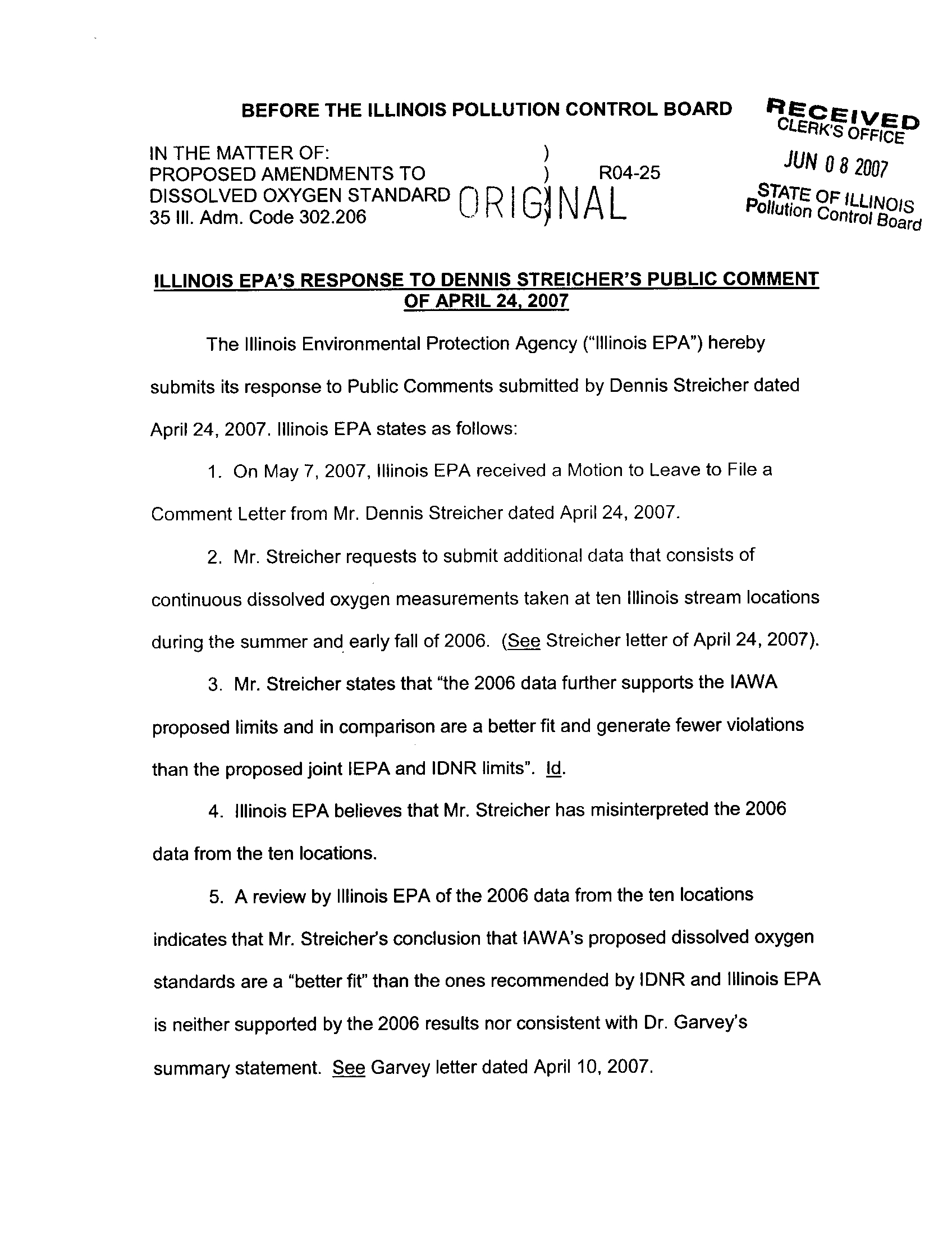 ILLINOIS EPA'S RESPONSE TO DENNIS STREICHER'S PUBLIC COMMENT