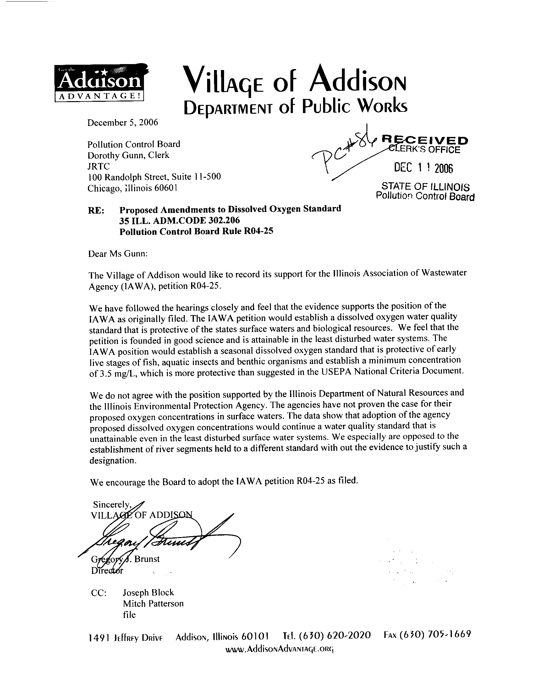 The Village of Addison would like to record its support for the Illinois Association of Wastewater