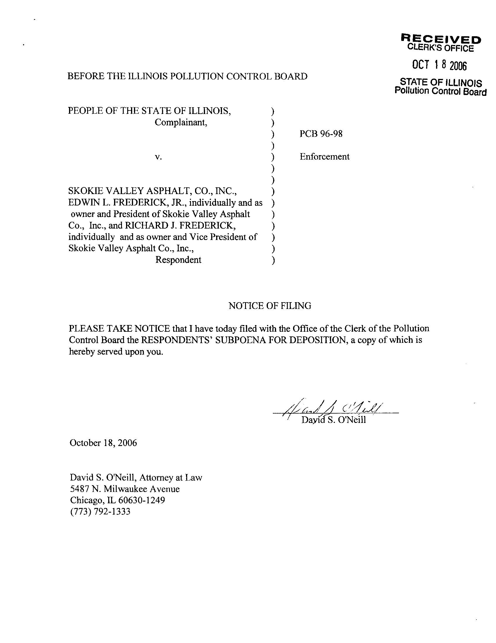PLEASE TAKE NOTICE that I have today filed with the Office of the Clerk of the Pollution