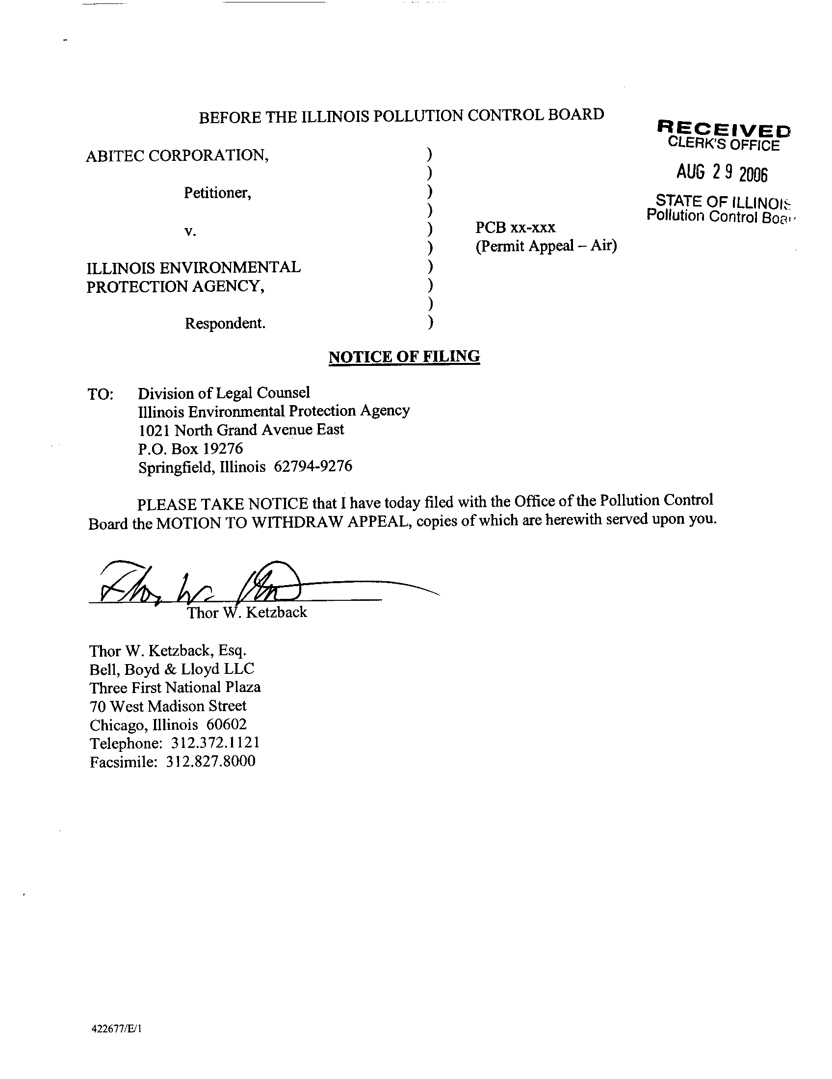 PLEASE TAKE NOTICE that I have today filed with the Office of the Pollution Control