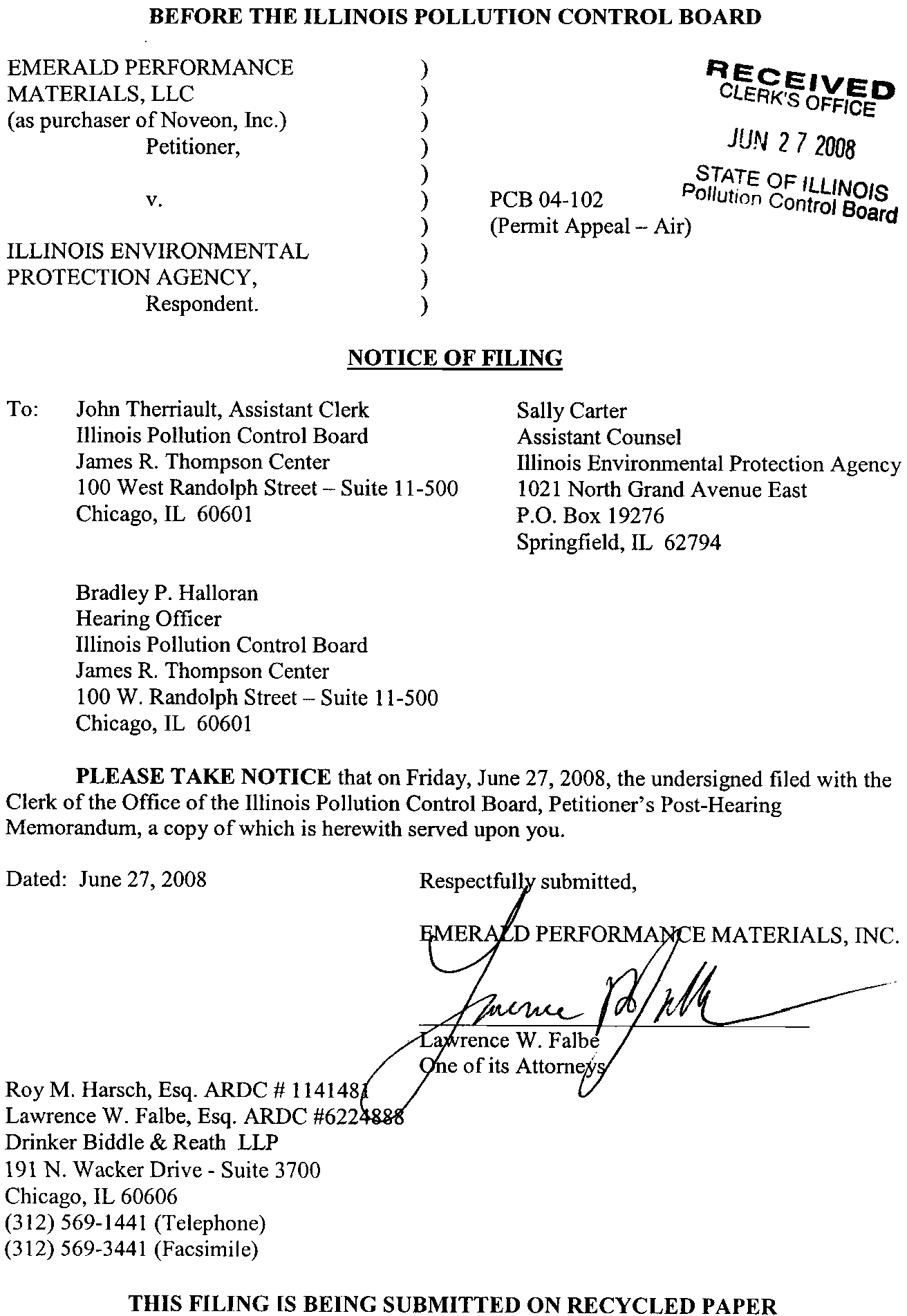 Clerk of the Office of the Illinois Pollution Control Board, Petitioner's Post-Hearing