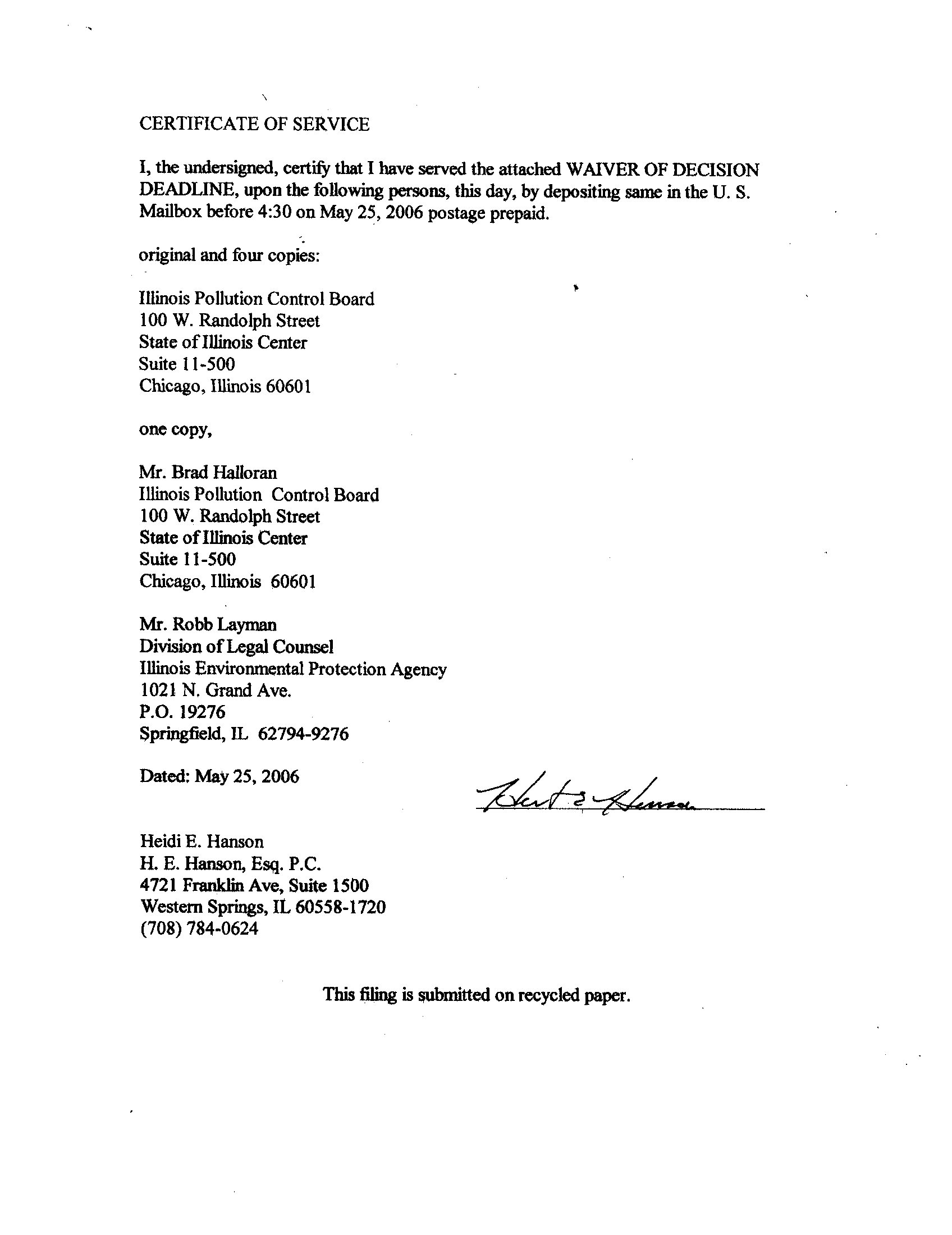 I, the undersigned, certify that I have served the attached WAIVER OF DECISION
