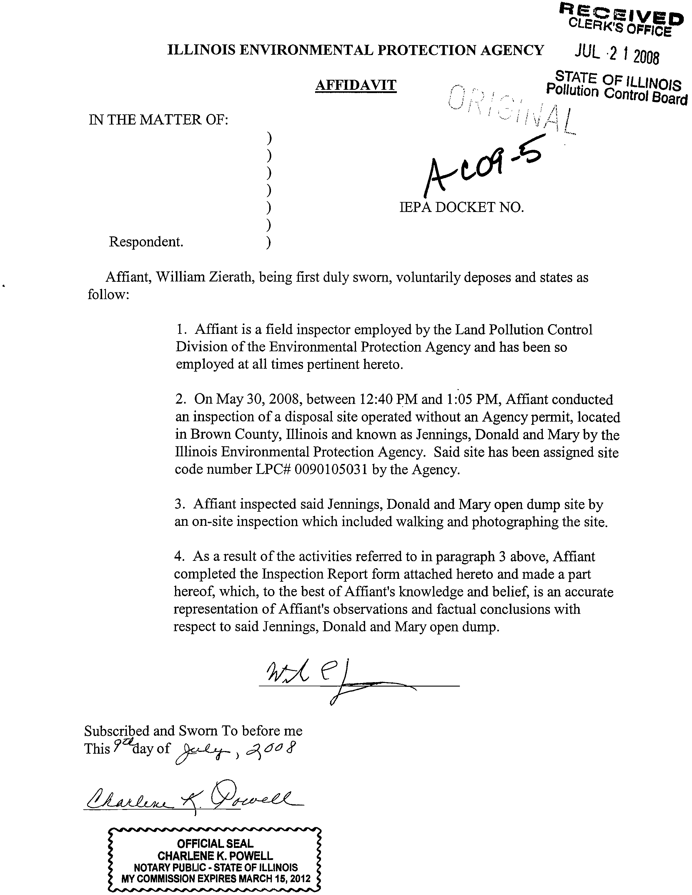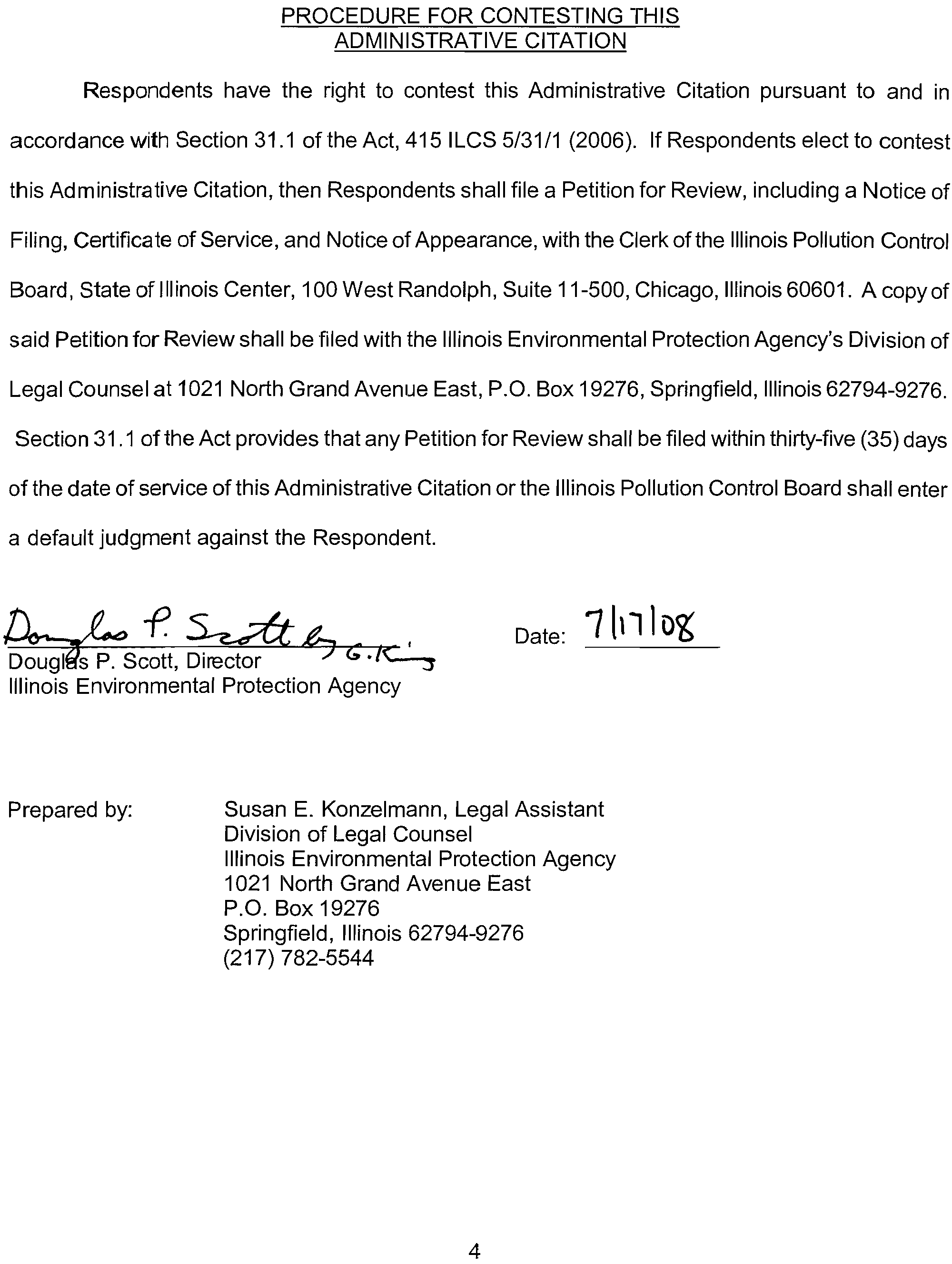 Citation, the inspector's Affidavit, and the inspector's Illinois Environmental Protection Agency