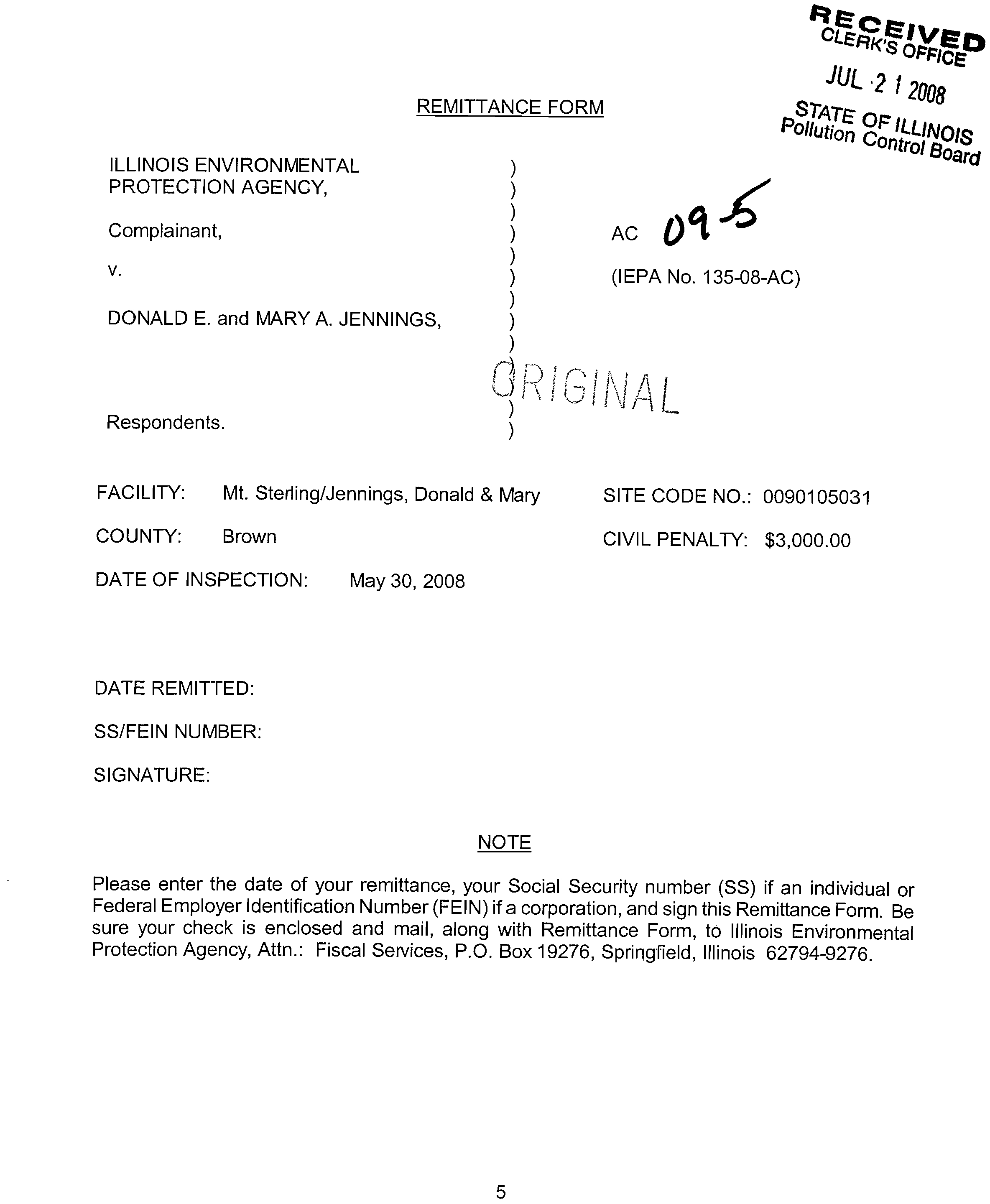 Illinois Environmental Protection Agency v. Donald E. and Mary A. Jennings
