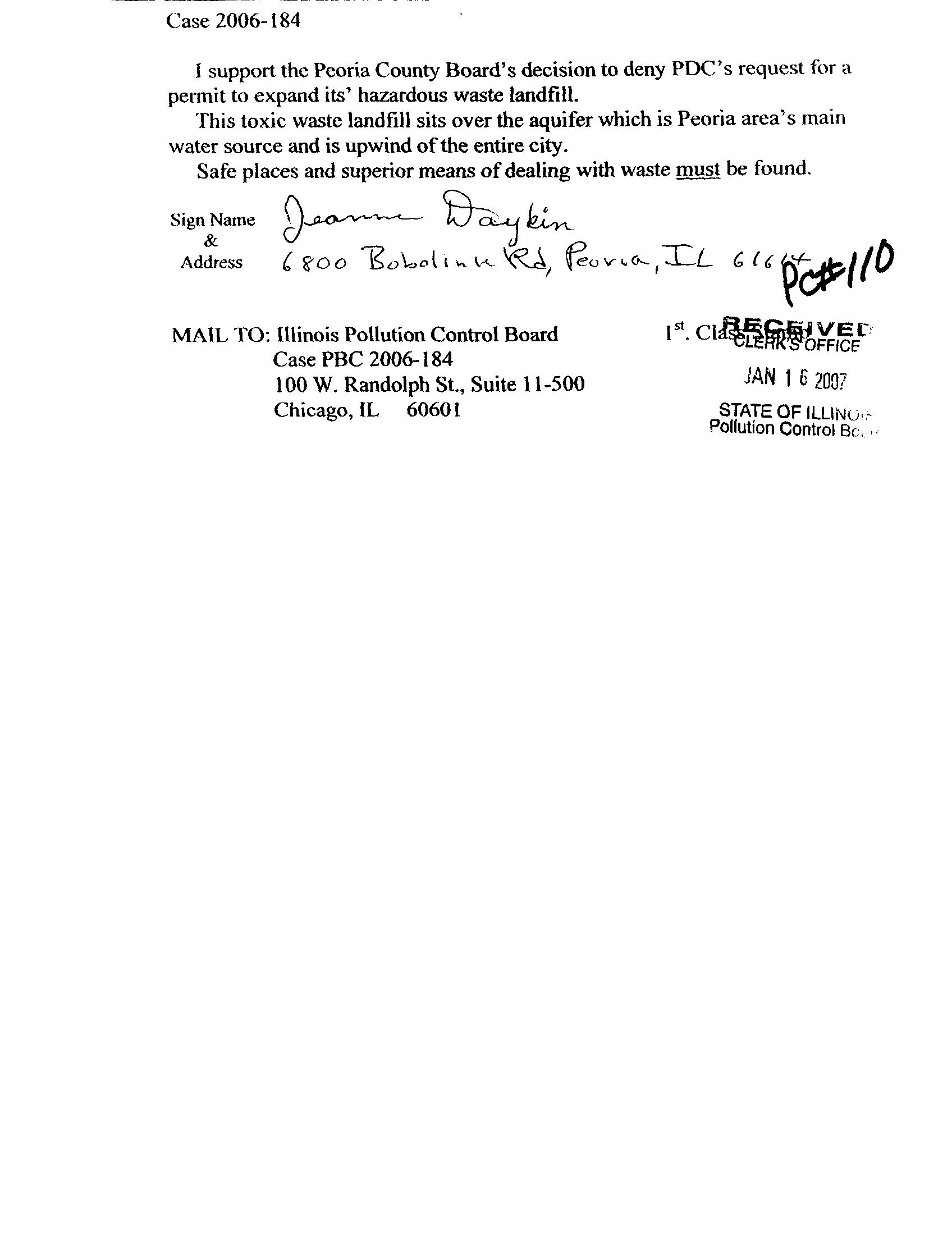 I support the Peoria County Board's decision to deny PDC's request for a