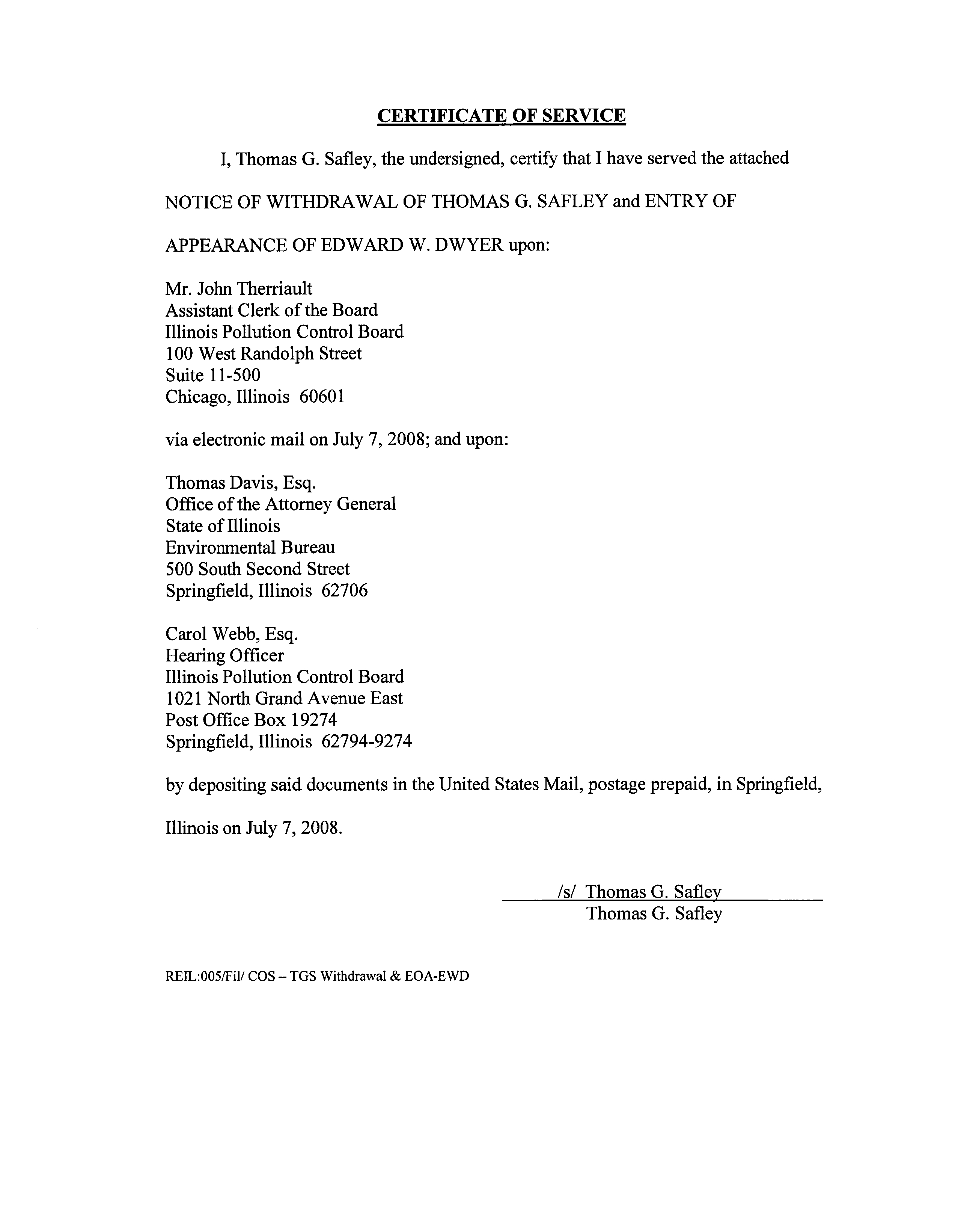 OF WITHDRAWAL OF THOMAS G. SAFLEY and ENTRY OF