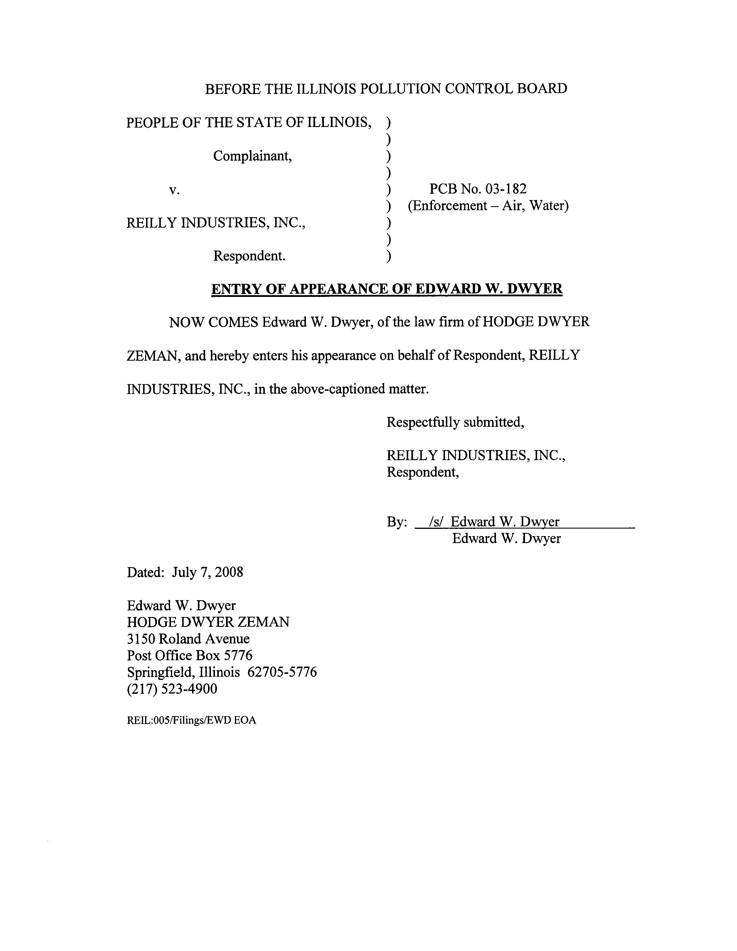and ENTRY OF APPEARANCE OF EDWARD W. DWYER,