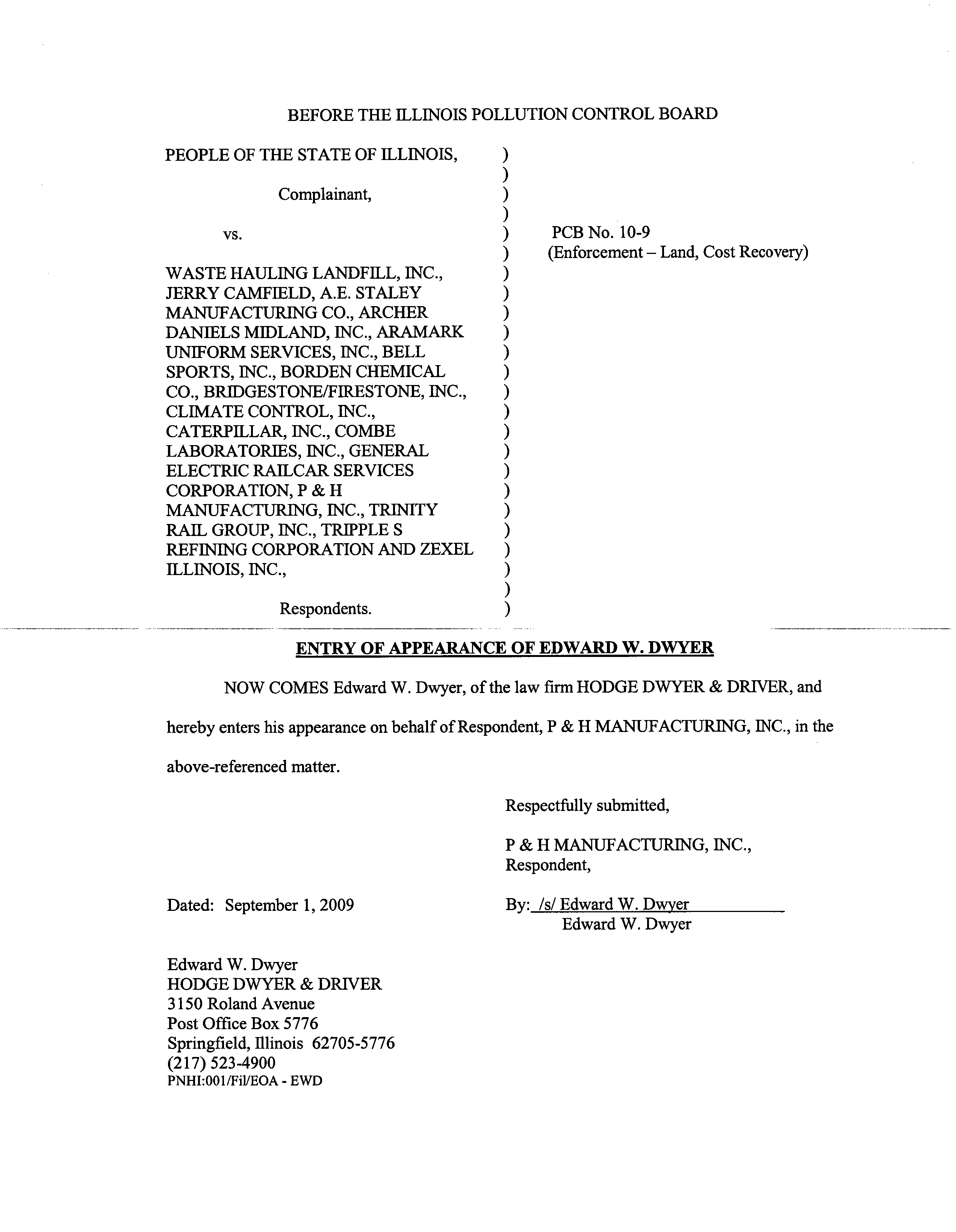Illinois Pollution Control Board an ENTRY OF APPEARANCE OF EDWARD W. DWYER,