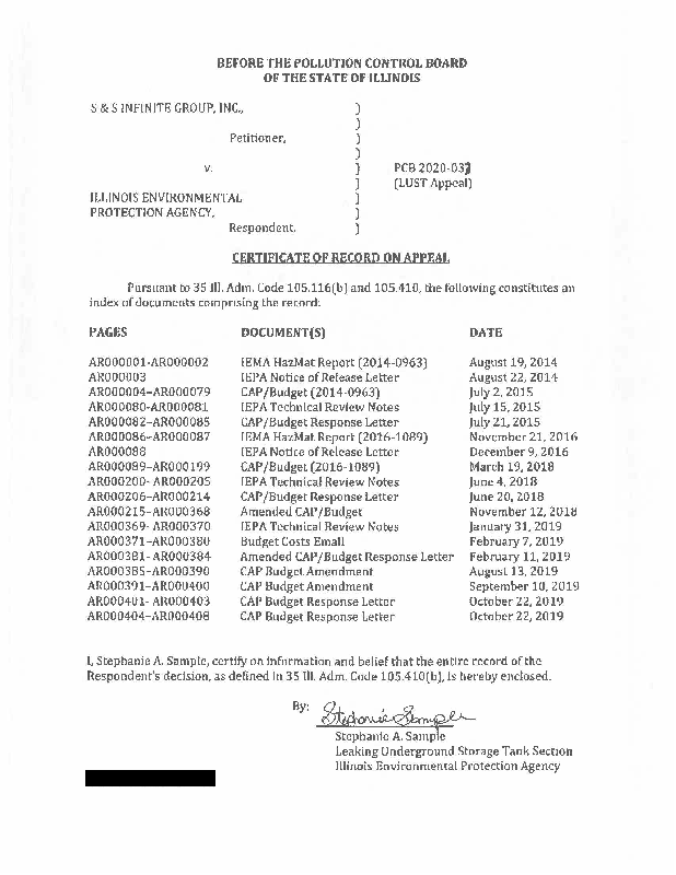 S & S Infinite Group, Inc (2020) Appearance, Adminstrative Record, and Certificate of Record on Appeal.pdf