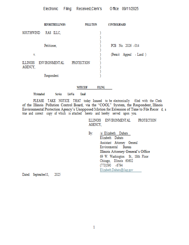 Version 1 Southwind v. IEPA (2026-014) NOF & Motion for extension of time to file administrative record 9-11-25.pdf