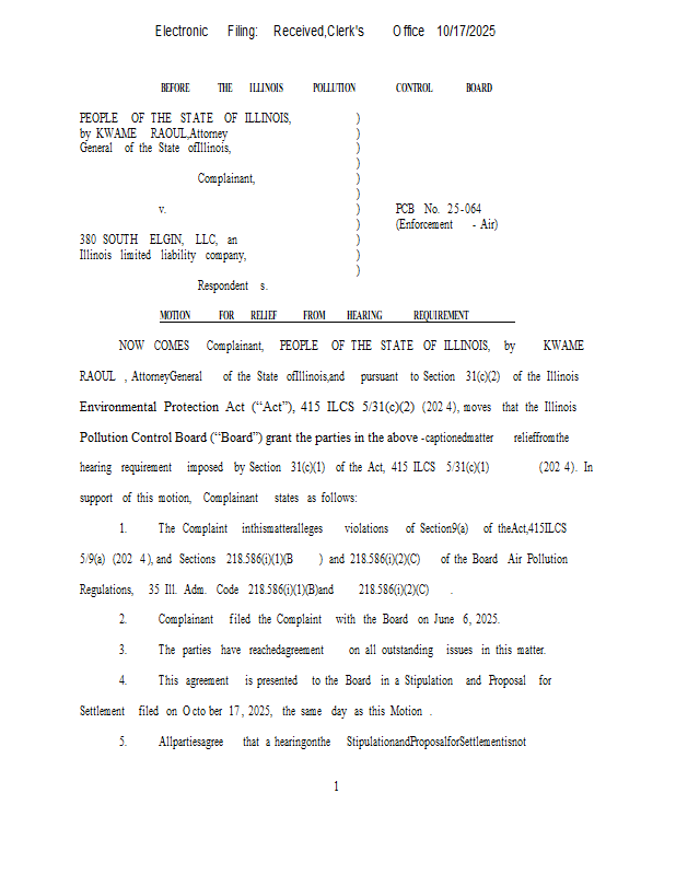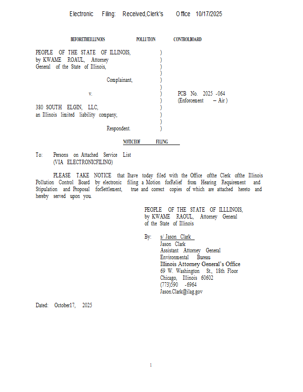 Version 1 380 S. Elgin LLC- NOF & Mtn for Relief and Stipulation and Proposed Settlement 10-17-25.pdf