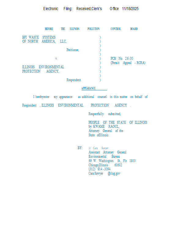 Version 1 BFI Waste Systems v. IEPA (PCB 2026-030) NOF & Appearance of C. Sawyer 11-18-25.pdf