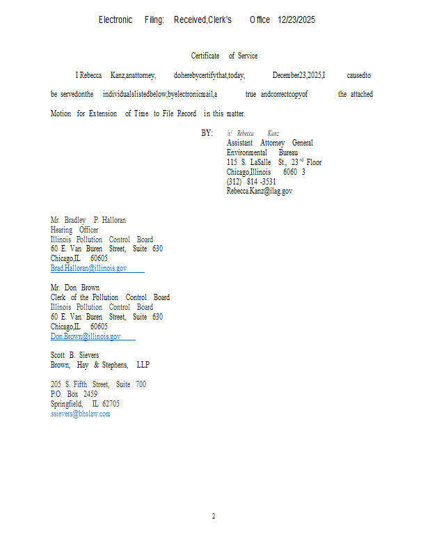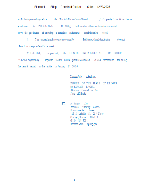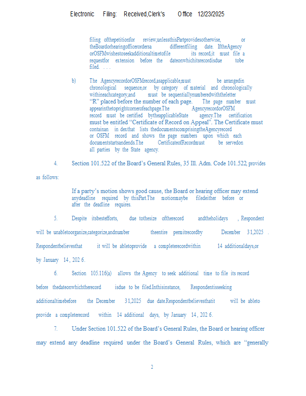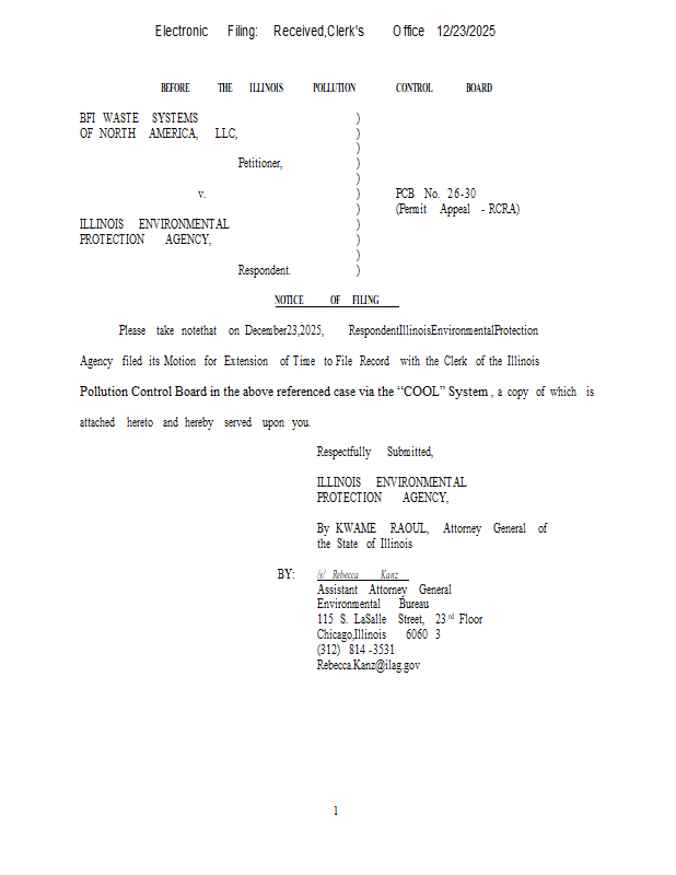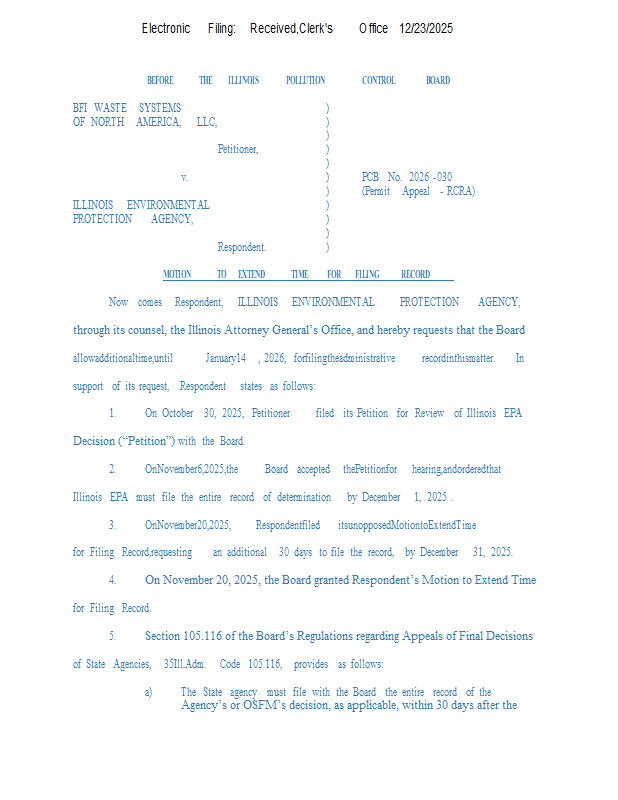 Version 1 BFI Waste Systems v. IEPA (PCB 2026-030) NOF & Mtn for Extension of Time 12-23-25.pdf